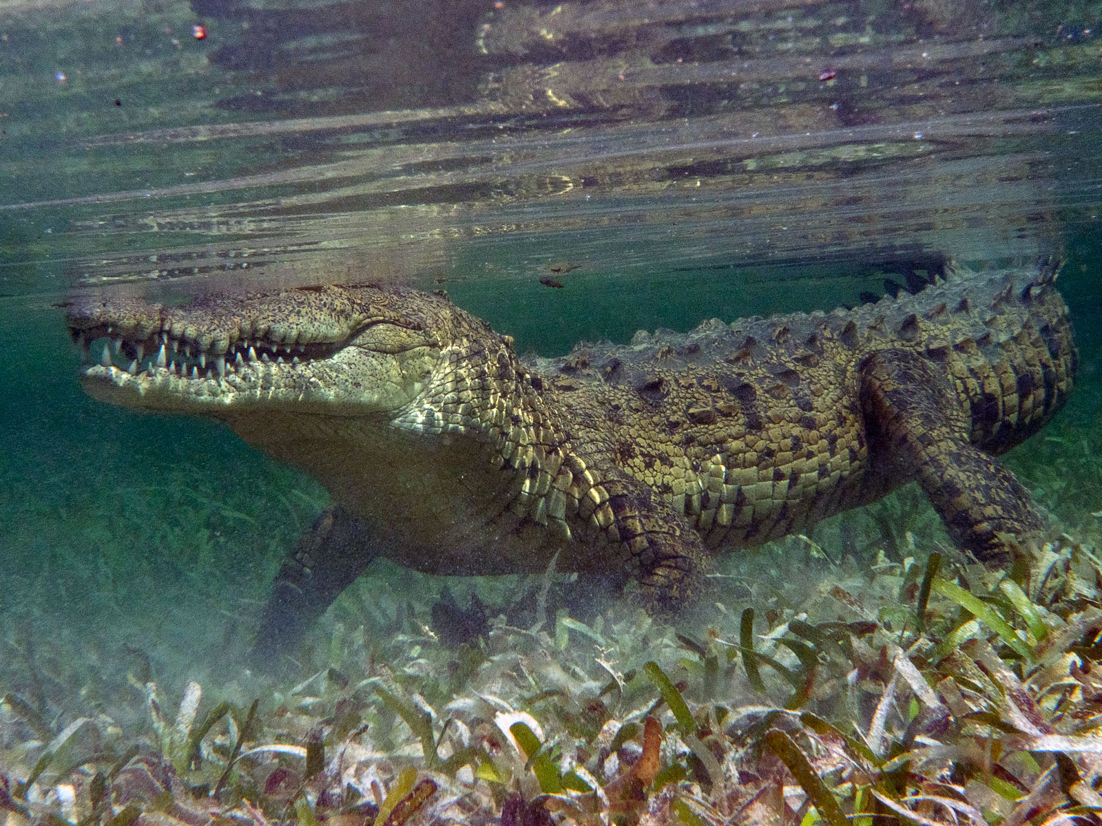 A Cuban crocodile, Crocodylus rhombifer, extremely endangered in the Gardens of the Queen off the coast of Cuba.