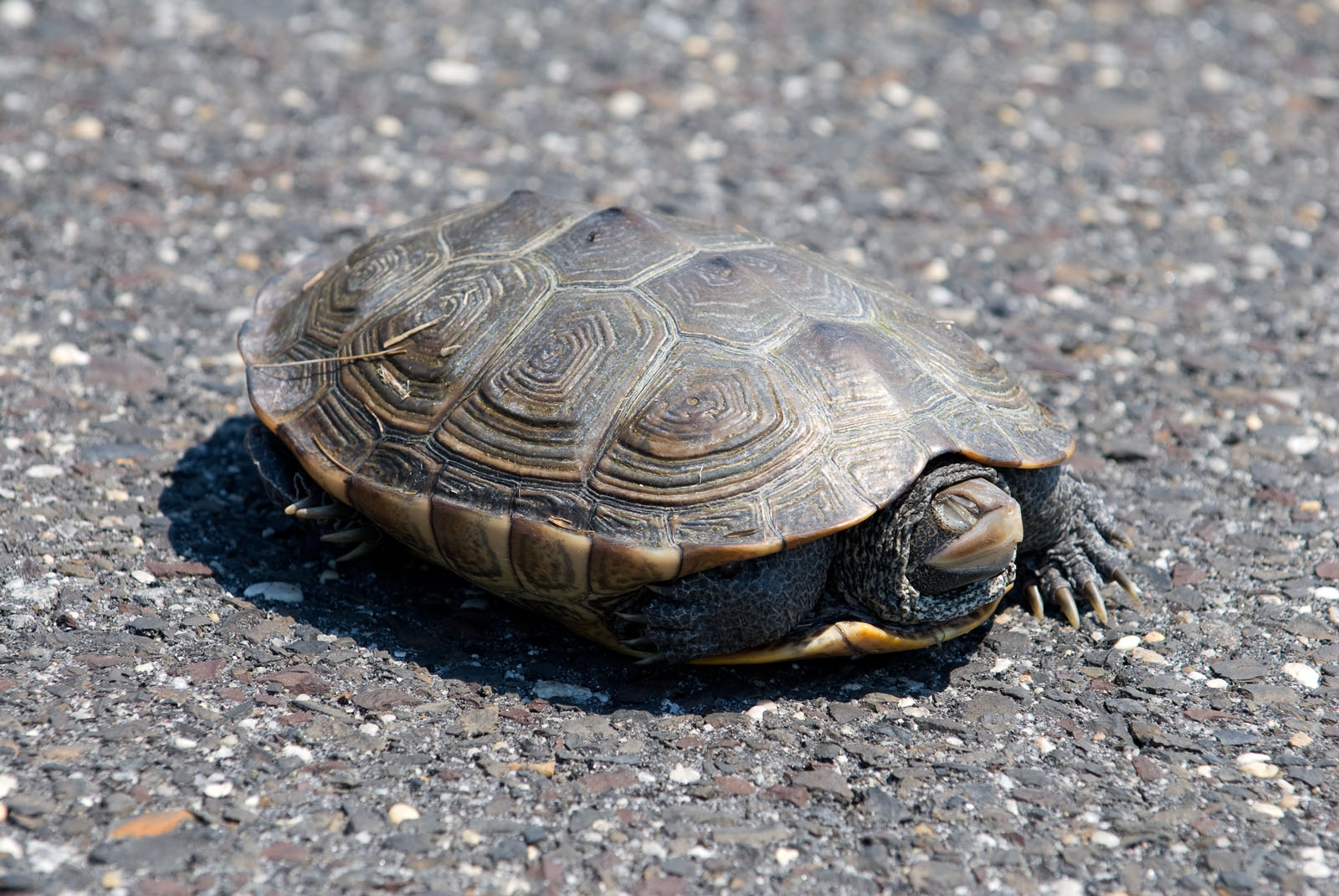 A diamondback terrapin, Malaclemys terrapin, crosses Great Bay Boulevard in Tuckerton, New Jersey, USA. This turtle is named for the diamond patterns on its top shell. The diamondback terrapin's range is along the Atlantic and Gulf coasts, from Cape Cod to Texas. It is believed to be the only turtle in the world that lives exclusively in brackish-water areas. In these areas, such as tidal marshes, estuaries, and lagoons, the water contains some salt, but it is not as salty as the ocean.