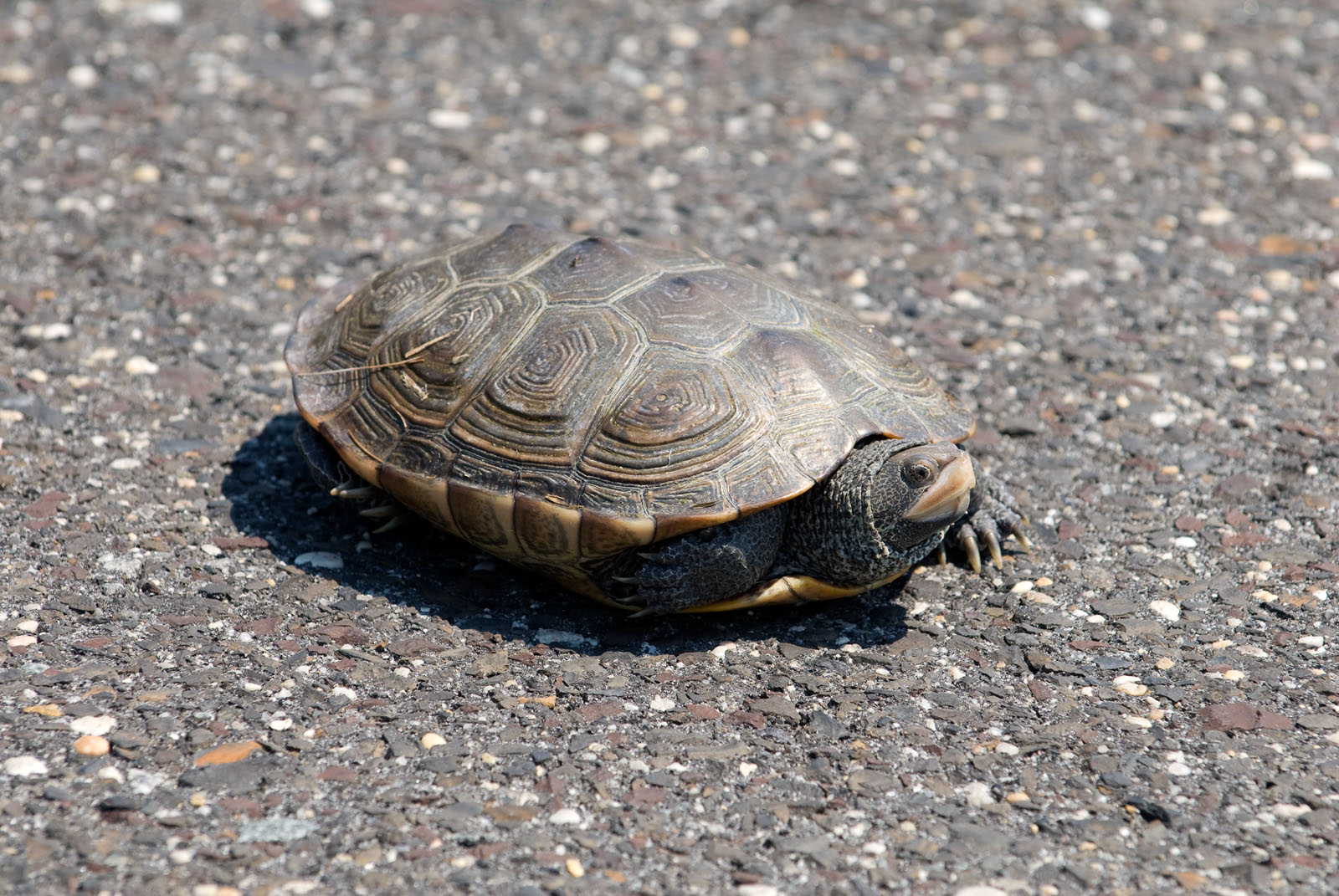 A diamondback terrapin, Malaclemys terrapin, crosses Great Bay Boulevard in Tuckerton, New Jersey, USA. This turtle is named for the diamond patterns on its top shell. The diamondback terrapin's range is along the Atlantic and Gulf coasts, from Cape Cod to Texas. It is believed to be the only turtle in the world that lives exclusively in brackish-water areas. In these areas, such as tidal marshes, estuaries, and lagoons, the water contains some salt, but it is not as salty as the ocean.