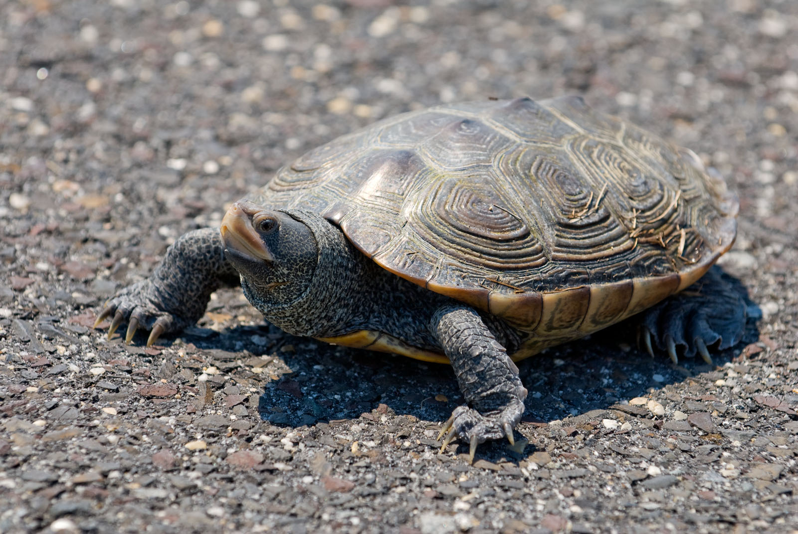 A diamondback terrapin, Malaclemys terrapin, crosses Great Bay Boulevard in Tuckerton, New Jersey, USA. This turtle is named for the diamond patterns on its top shell. The diamondback terrapin's range is along the Atlantic and Gulf coasts, from Cape Cod to Texas. It is believed to be the only turtle in the world that lives exclusively in brackish-water areas. In these areas, such as tidal marshes, estuaries, and lagoons, the water contains some salt, but it is not as salty as the ocean.