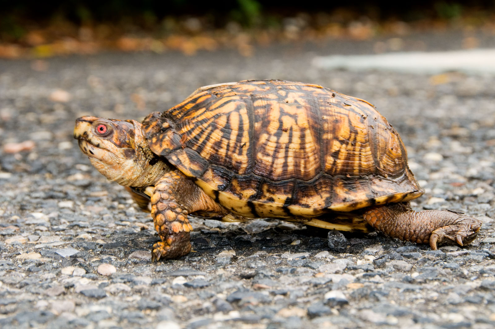 An eastern box turtle, Terrapene carolina, in a yard in Brick, New Jersey, USA.