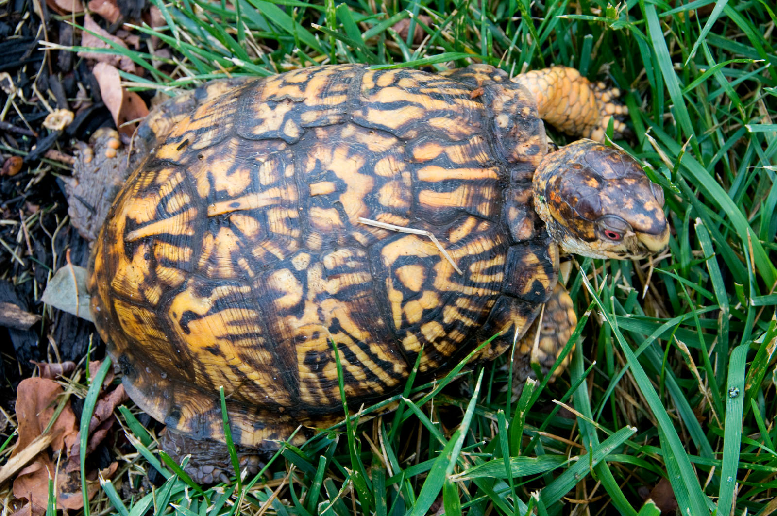 An eastern box turtle, Terrapene carolina, in a yard in Brick, New Jersey, USA.