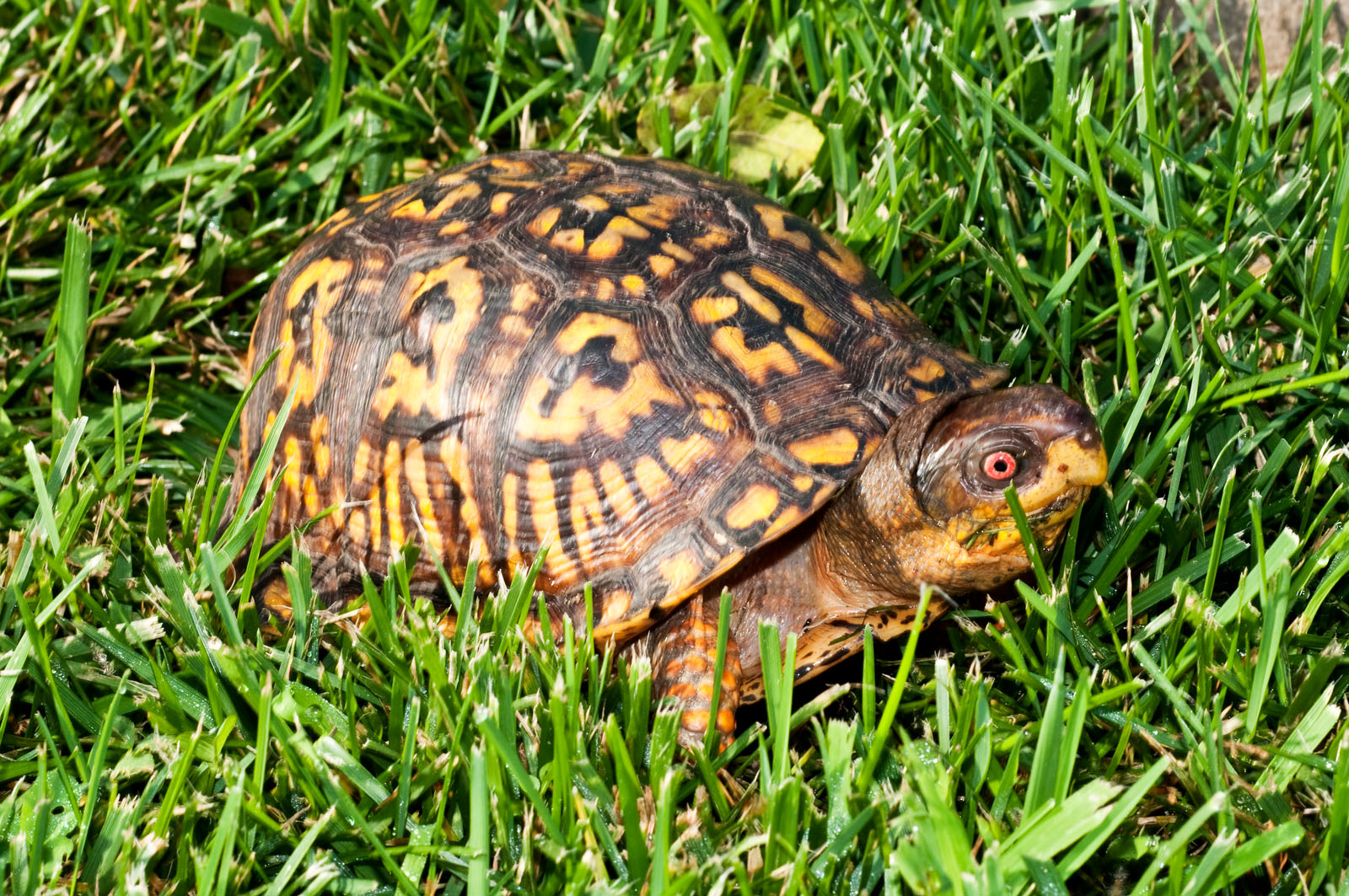An eastern box turtle, Terrapene carolina, in a yard in Brick, New Jersey, USA.