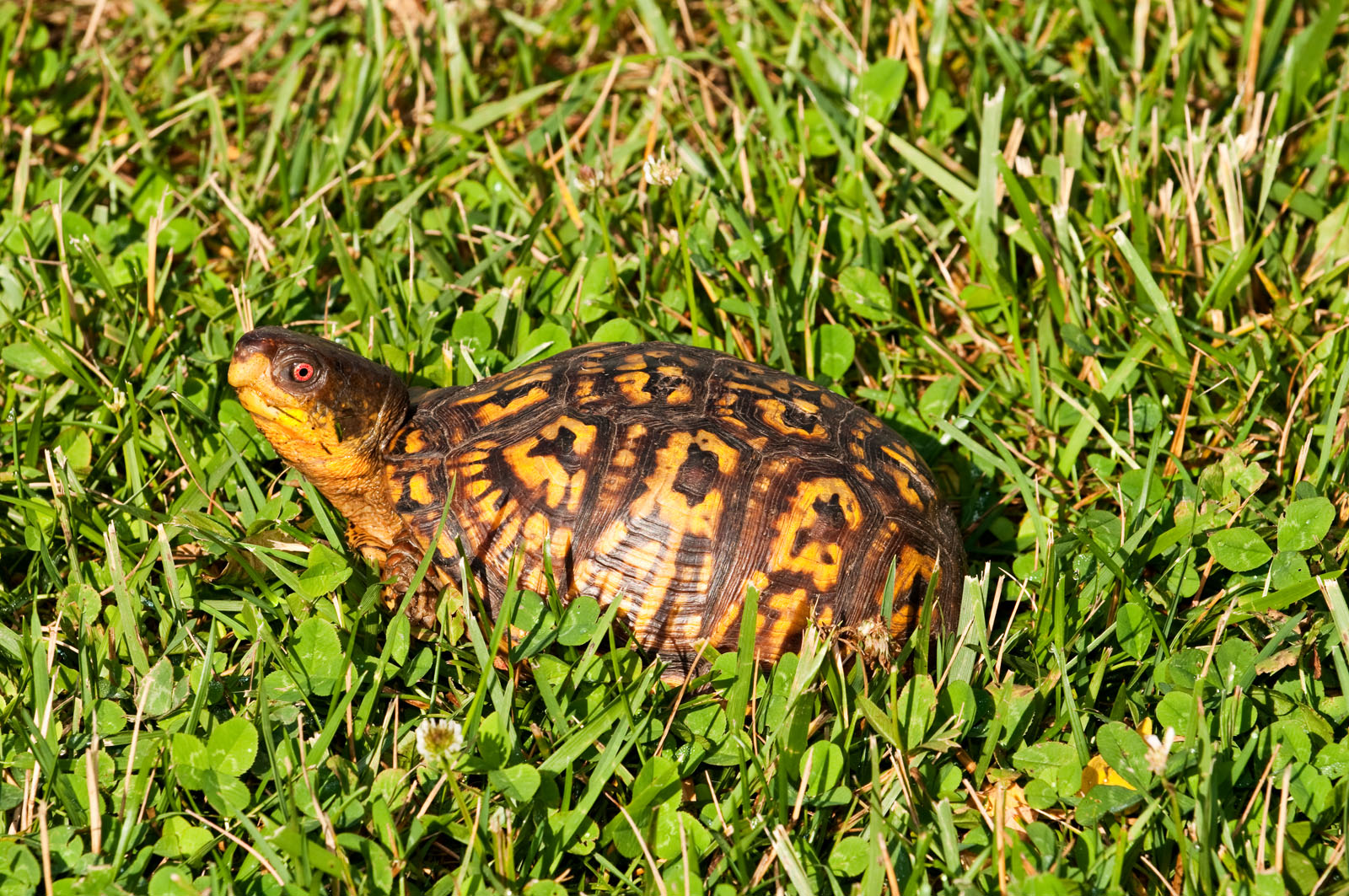 An eastern box turtle, Terrapene carolina, in a yard in Brick, New Jersey, USA.