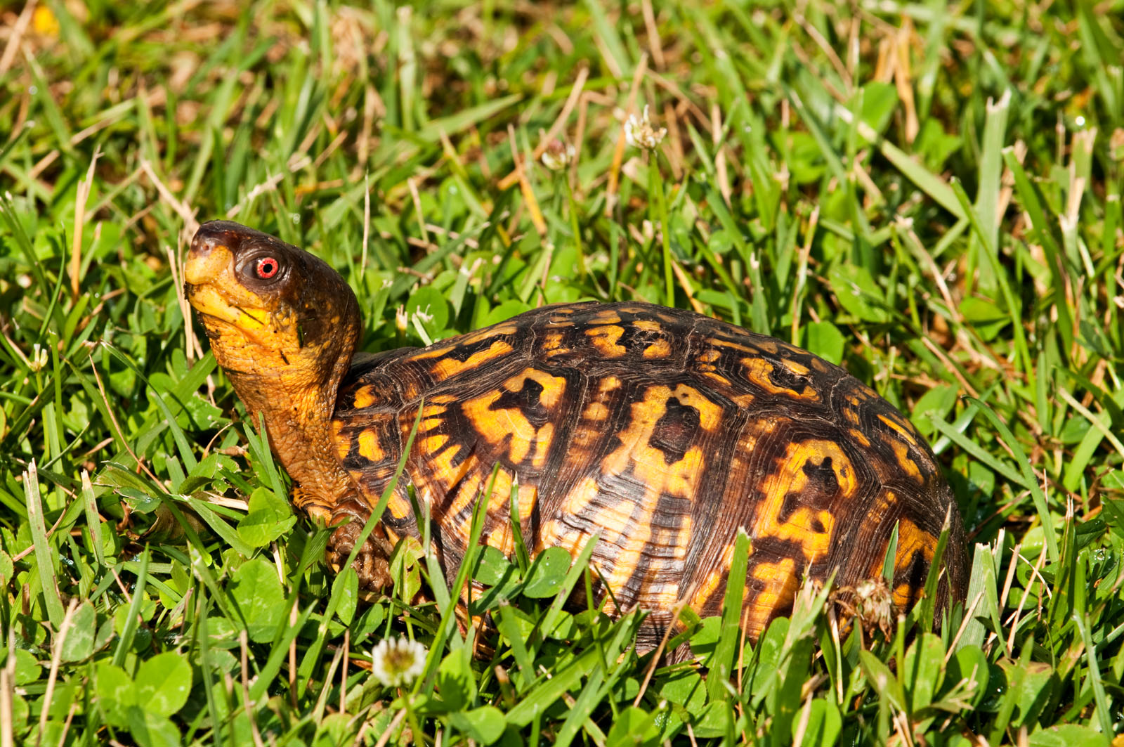 An eastern box turtle, Terrapene carolina, in a yard in Brick, New Jersey, USA.