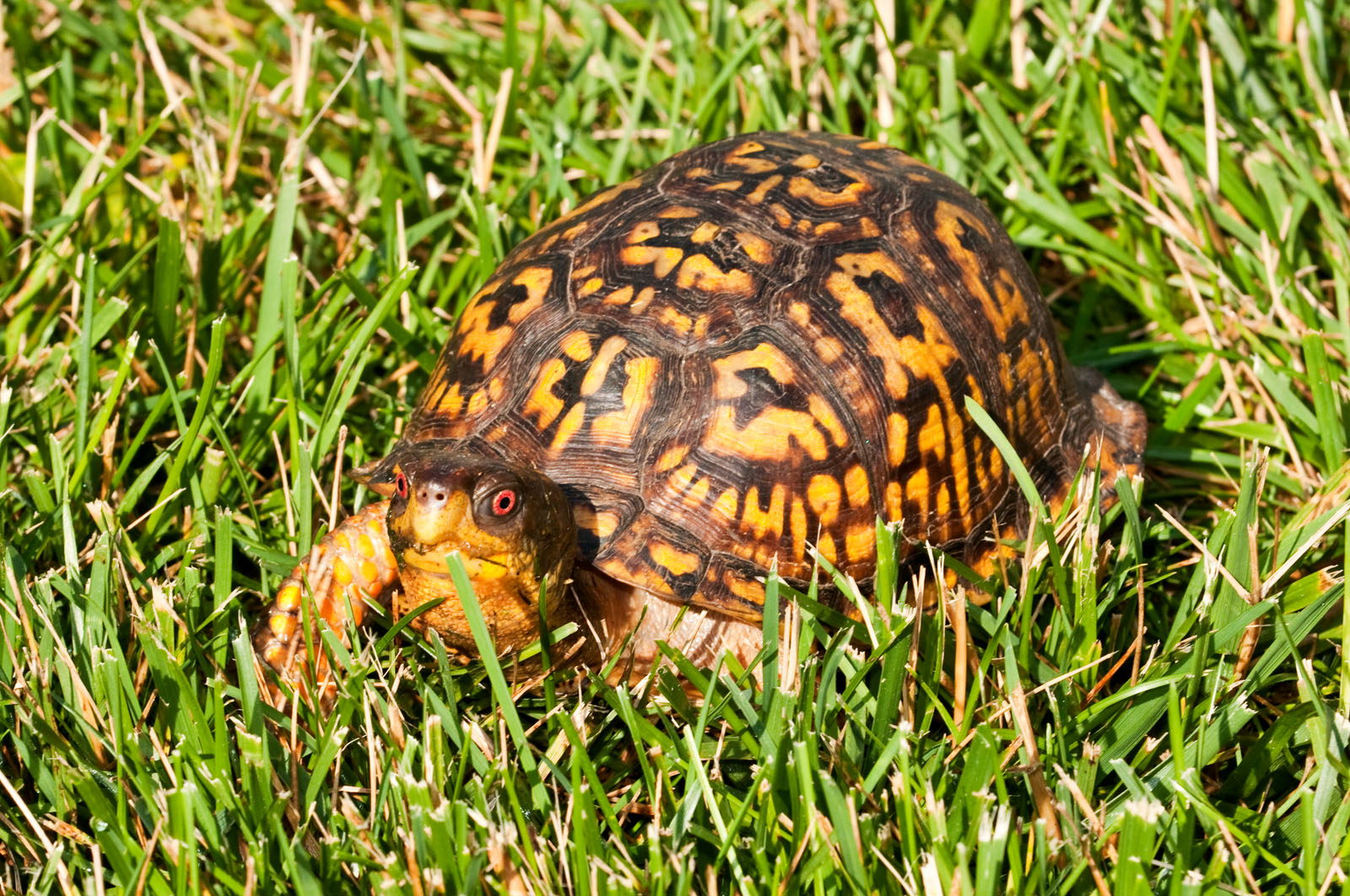 An eastern box turtle, Terrapene carolina, in a yard in Brick, New Jersey, USA.