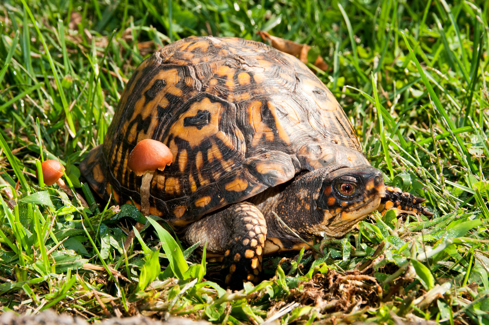 An eastern box turtle, Terrapene carolina, in a backyard in Brick, New Jersey, USA.
