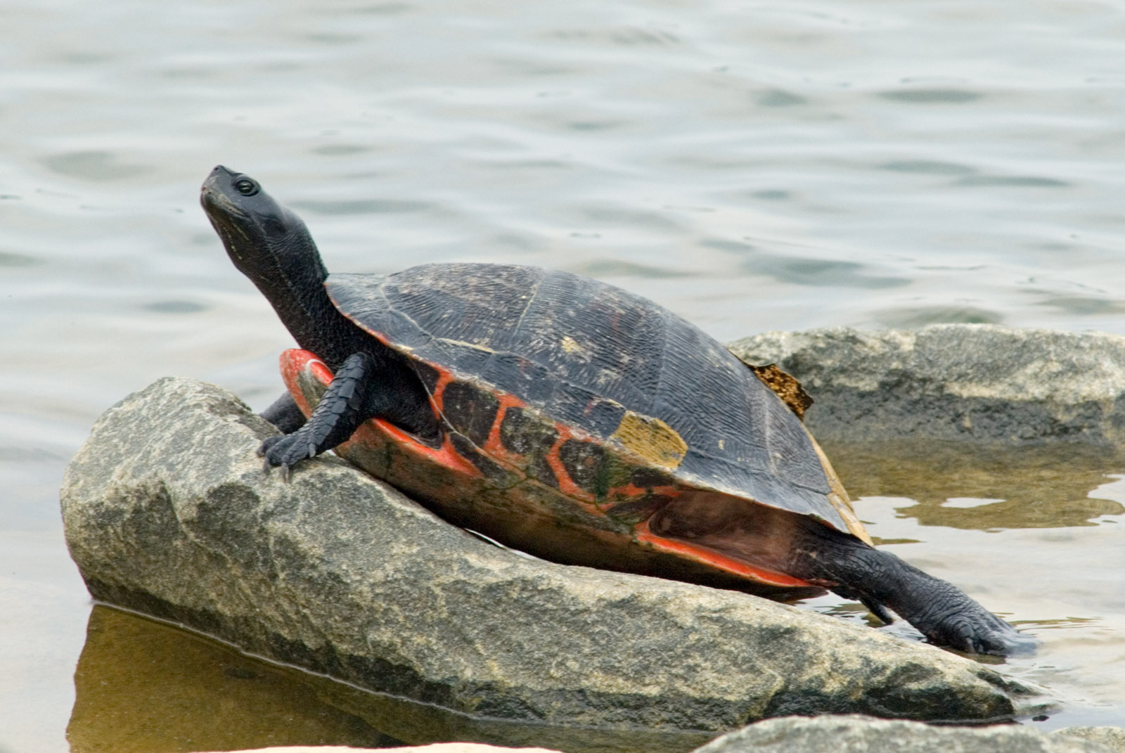 An eastern red-bellied turtle, Pseudemys rubriventris (Chrysemys rubriventris), named "Gus" by the employees basks on a rock at the Brick Reservoir in Brick, NJ, USA.
