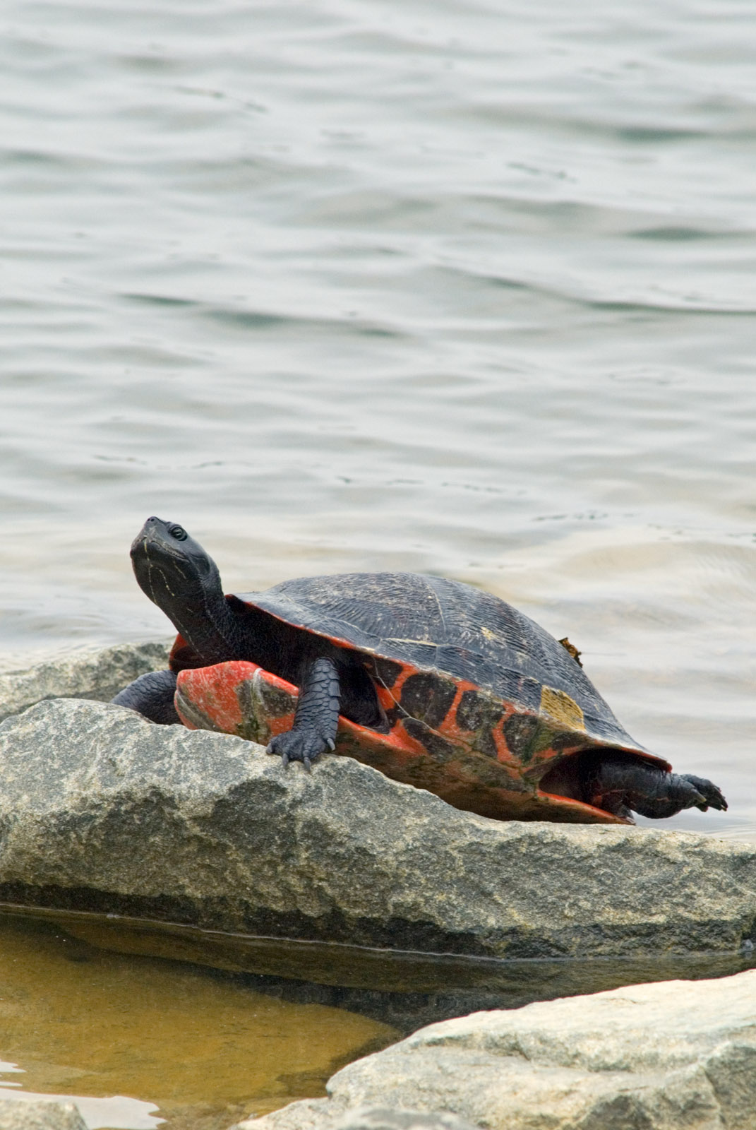 An eastern red-bellied turtle, Pseudemys rubriventris (Chrysemys rubriventris), named "Gus" by the employees basks on a rock at the Brick Reservoir in Brick, NJ, USA.