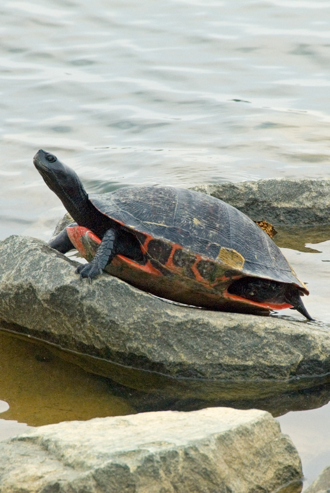 An eastern red-bellied turtle, Pseudemys rubriventris (Chrysemys rubriventris), named "Gus" by the employees basks on a rock at the Brick Reservoir in Brick, NJ, USA.
