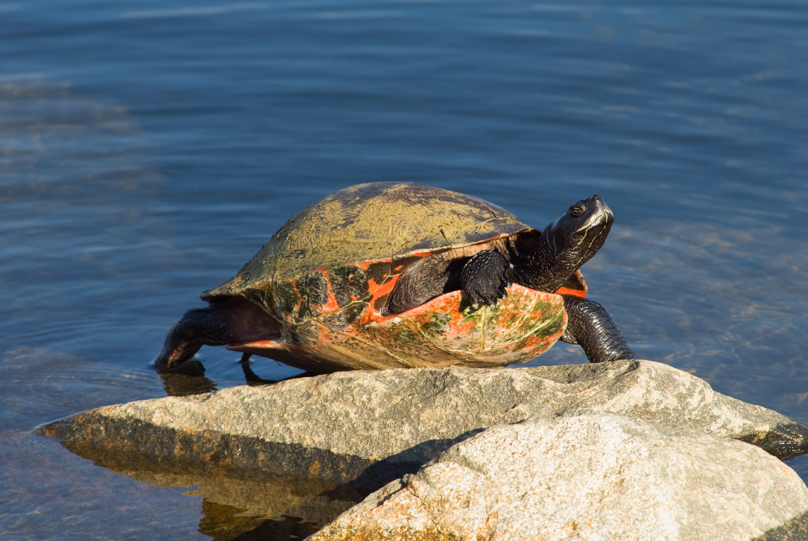 An eastern red-bellied turtle, Pseudemys rubriventris (Chrysemys rubriventris), affectionately named "Gus" by the reservoir personnel basks in the sun at the Brick Reservoir in Brick, New Jersey, USA.