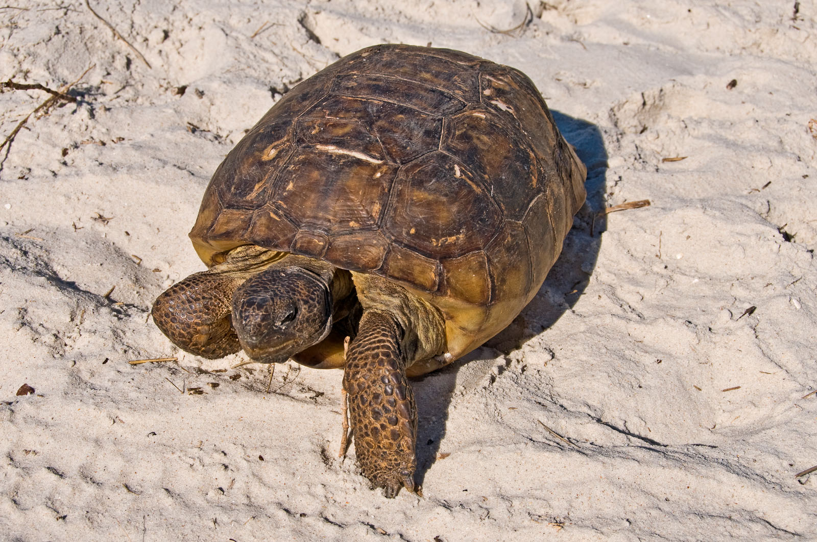 A gopher tortoise, Gopherus polyphemus, in the sand dunes along Ponce Inlet in New Smyrna Beach, Florida, USA. It belongs to a group of land tortoises that originated in western North America nearly 60 million years ago. Gopher tortoises, or "gophers" as they are commonly called, live in extensive subterranean burrows in dry upland habitats.