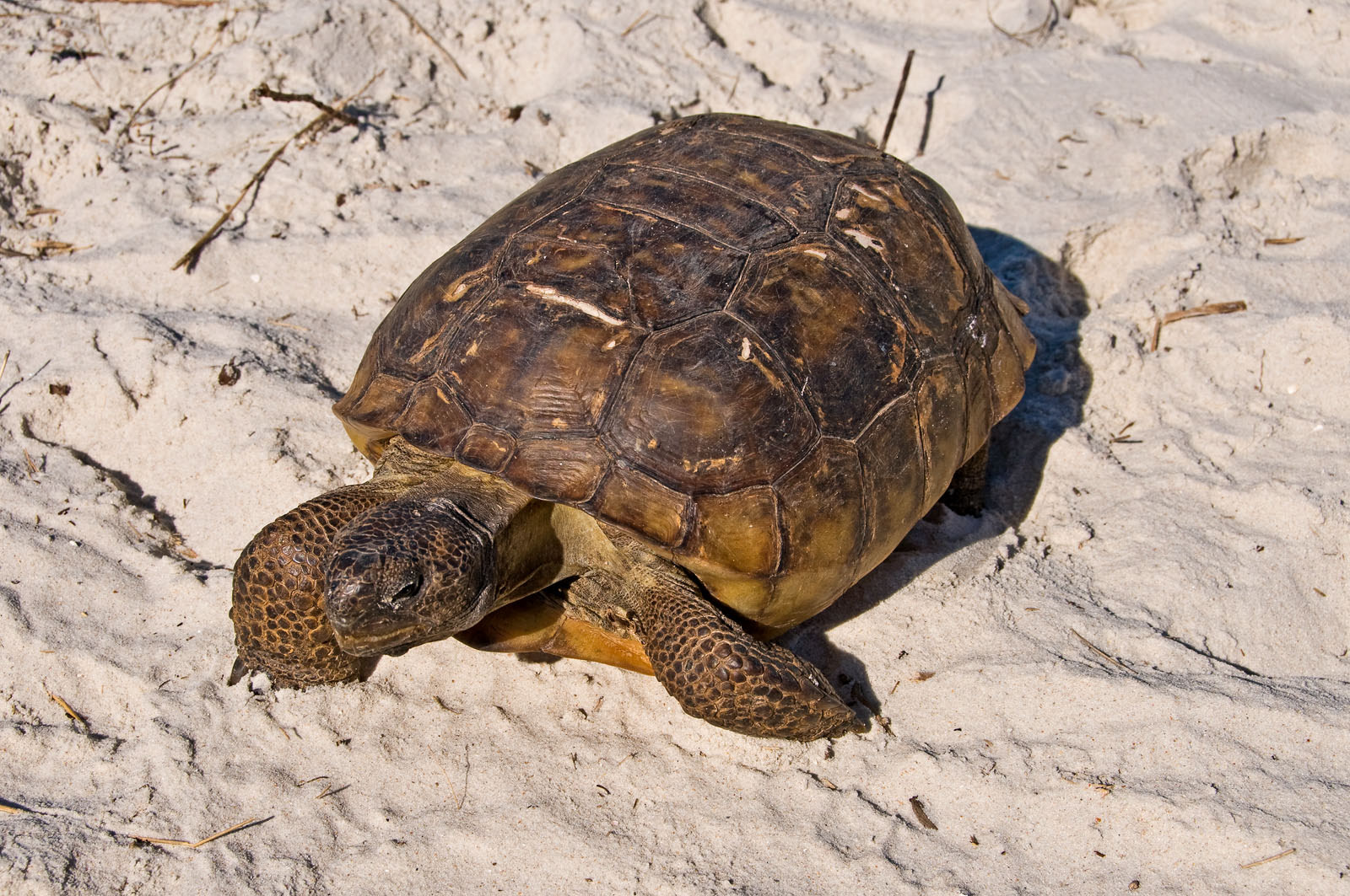 A gopher tortoise, Gopherus polyphemus, in the sand dunes along Ponce Inlet in New Smyrna Beach, Florida, USA. It belongs to a group of land tortoises that originated in western North America nearly 60 million years ago. Gopher tortoises, or "gophers" as they are commonly called, live in extensive subterranean burrows in dry upland habitats.