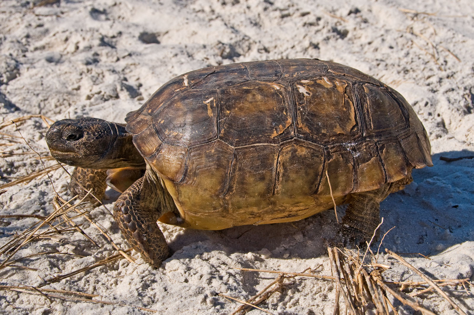 A gopher tortoise, Gopherus polyphemus, in the sand dunes along Ponce Inlet in New Smyrna Beach, Florida, USA. It belongs to a group of land tortoises that originated in western North America nearly 60 million years ago. Gopher tortoises, or "gophers" as they are commonly called, live in extensive subterranean burrows in dry upland habitats.
