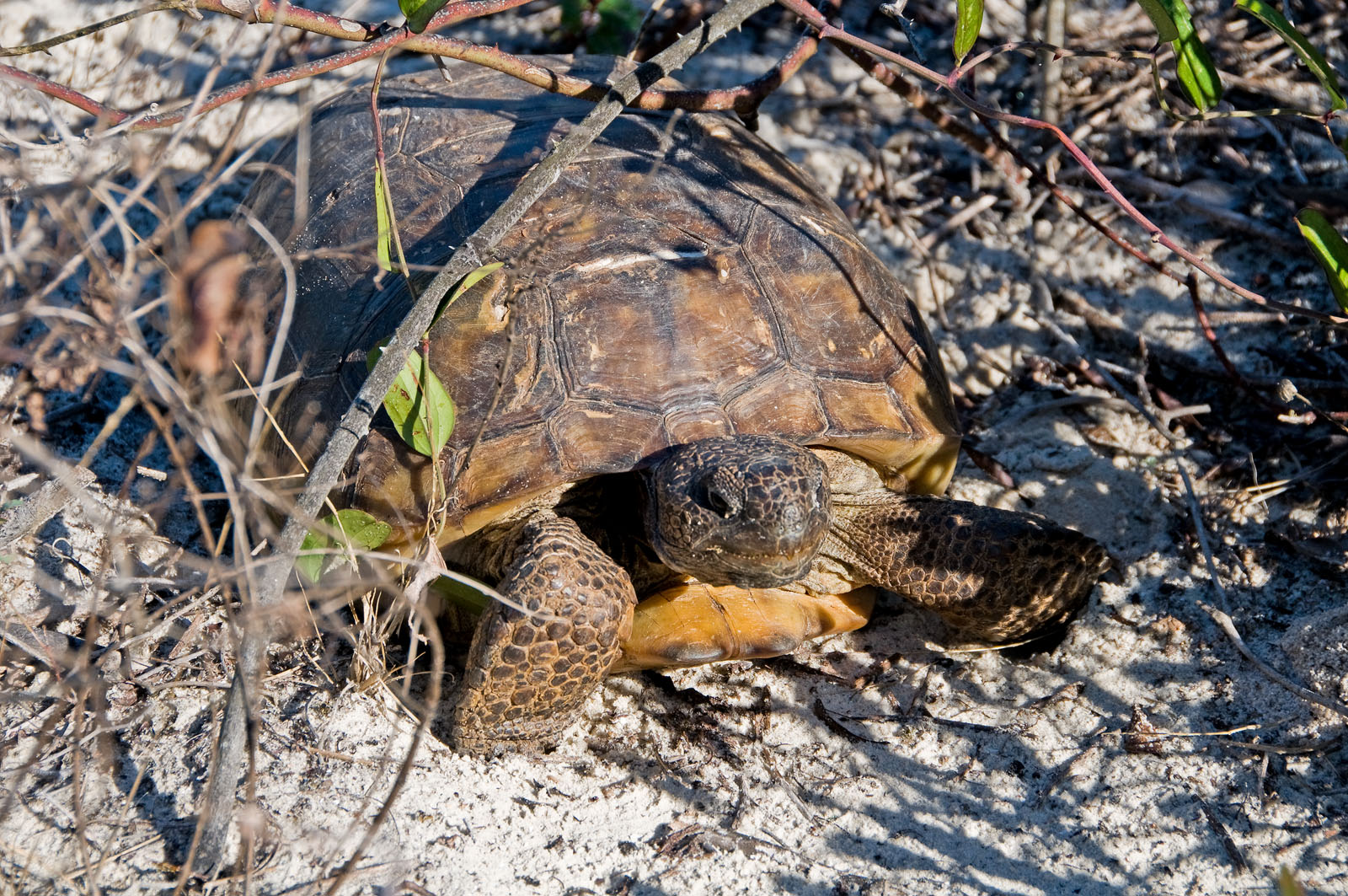 A gopher tortoise, Gopherus polyphemus, in the sand dunes along Ponce Inlet in New Smyrna Beach, Florida, USA. It belongs to a group of land tortoises that originated in western North America nearly 60 million years ago. Gopher tortoises, or "gophers" as they are commonly called, live in extensive subterranean burrows in dry upland habitats.