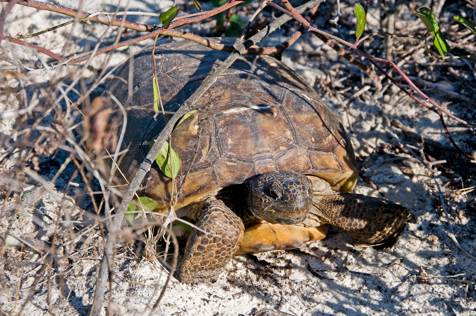 A gopher tortoise, Gopherus polyphemus, in the sand dunes along Ponce Inlet in New Smyrna Beach, Florida, USA. It belongs to a group of land tortoises that originated in western North America nearly 60 million years ago. Gopher tortoises, or "gophers" as they are commonly called, live in extensive subterranean burrows in dry upland habitats.