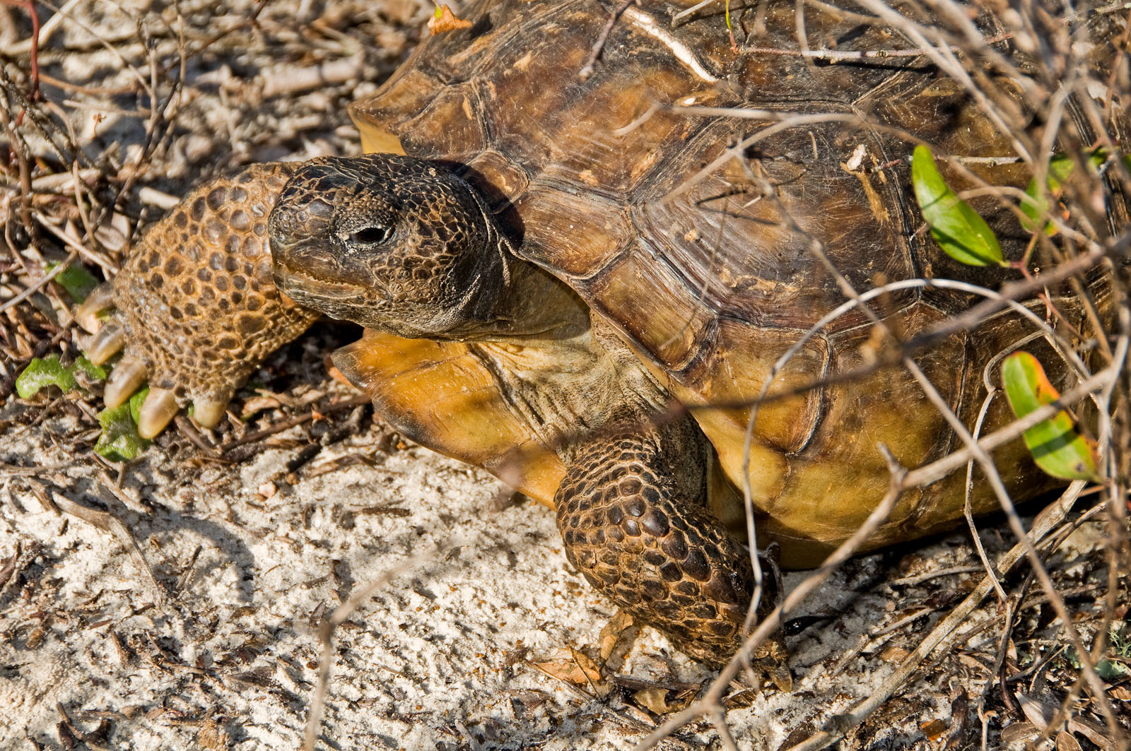 A gopher tortoise, Gopherus polyphemus, in the sand dunes along Ponce Inlet in New Smyrna Beach, Florida, USA. It belongs to a group of land tortoises that originated in western North America nearly 60 million years ago. Gopher tortoises, or "gophers" as they are commonly called, live in extensive subterranean burrows in dry upland habitats.