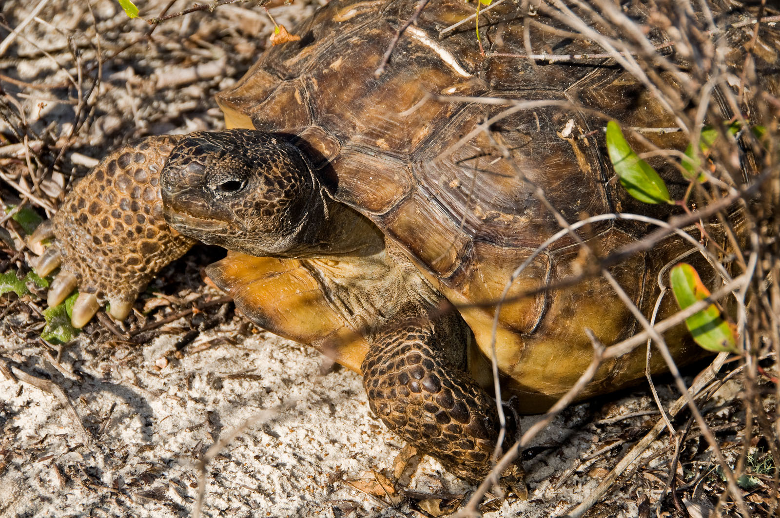 A gopher tortoise, Gopherus polyphemus, in the sand dunes along Ponce Inlet in New Smyrna Beach, Florida, USA. It belongs to a group of land tortoises that originated in western North America nearly 60 million years ago. Gopher tortoises, or "gophers" as they are commonly called, live in extensive subterranean burrows in dry upland habitats.