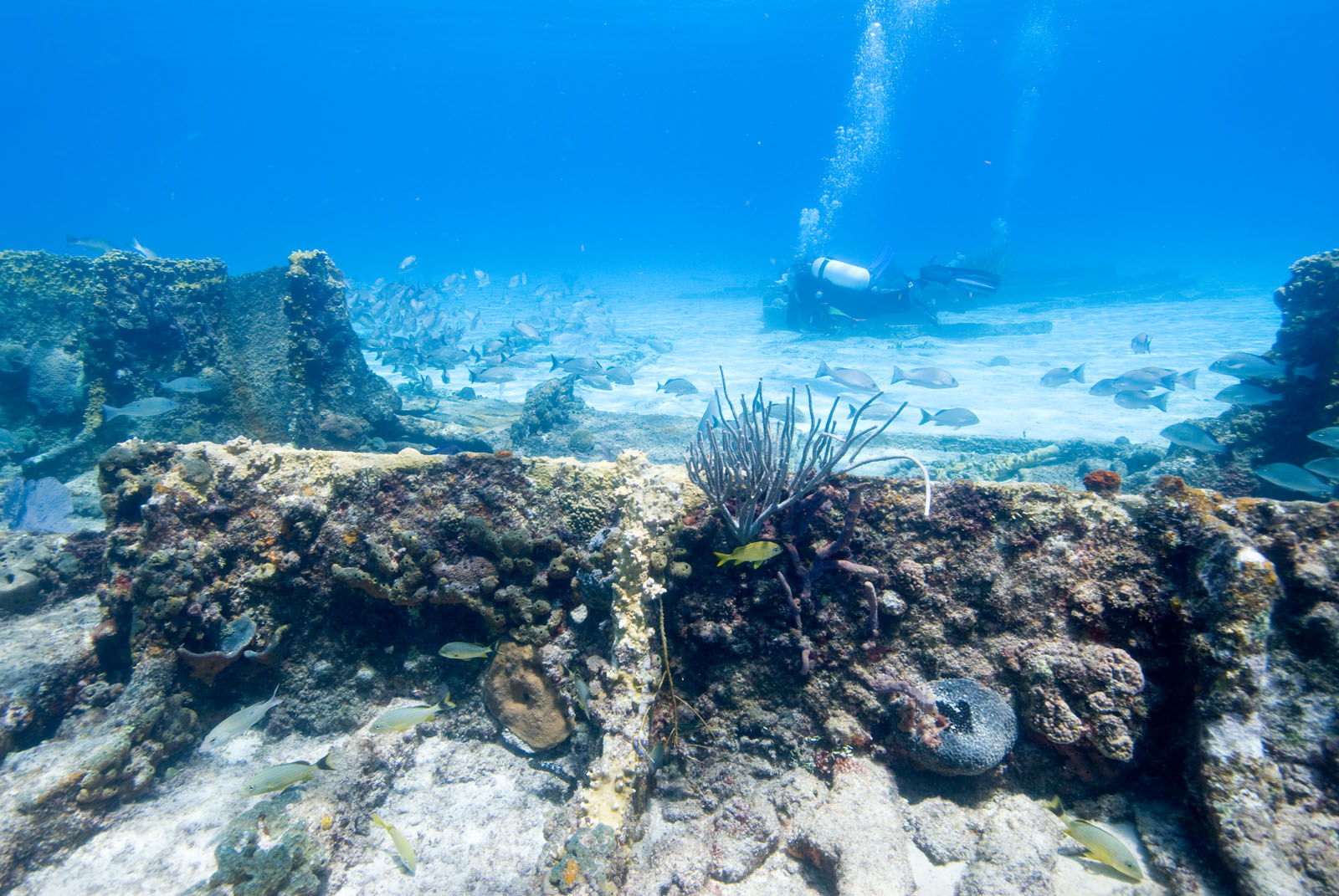 SCUBA divers on the Sugar Wreck north of Grand Bahama Island in the northern Bahamas.