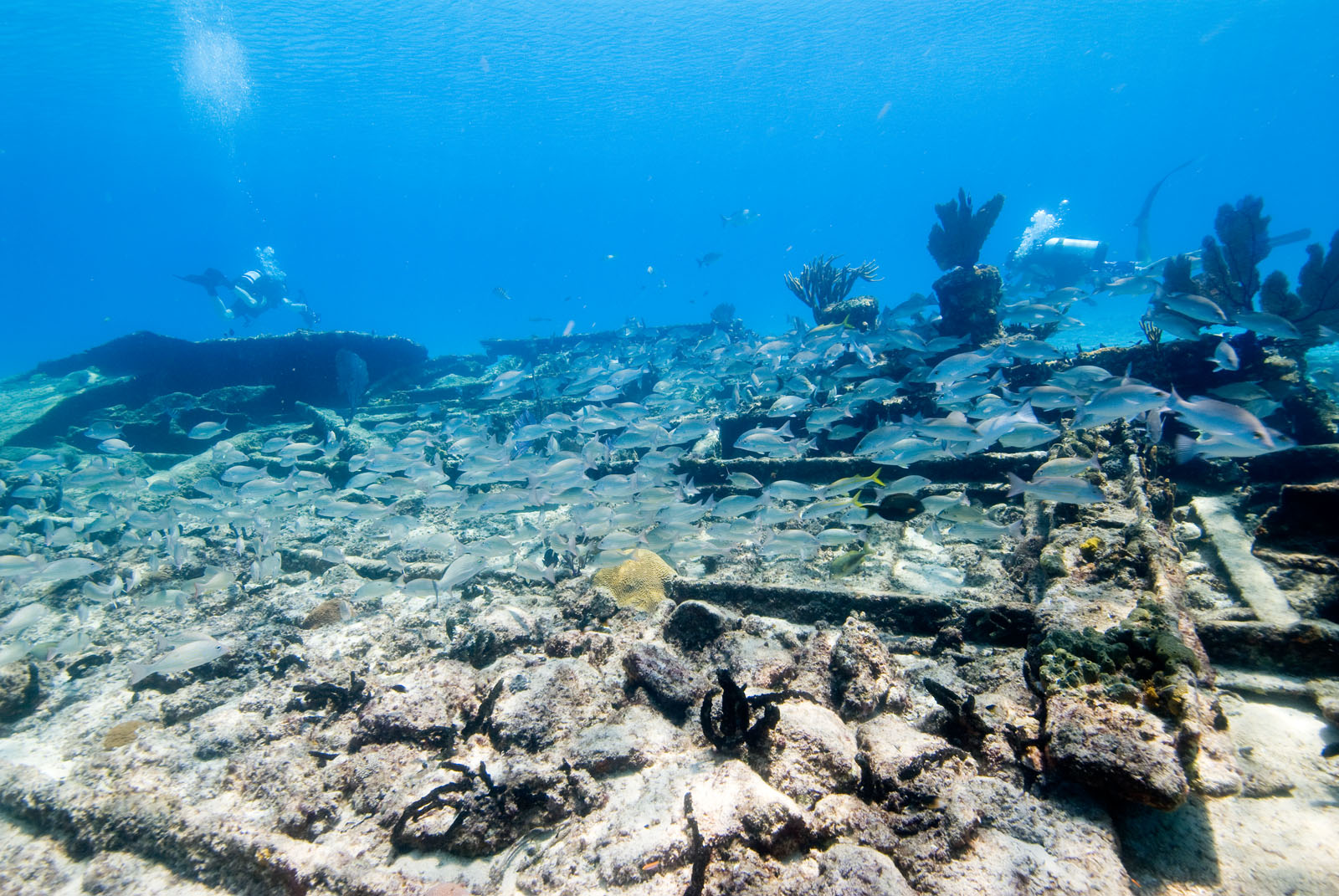 SCUBA divers on the Sugar Wreck north of Grand Bahama Island in the northern Bahamas.