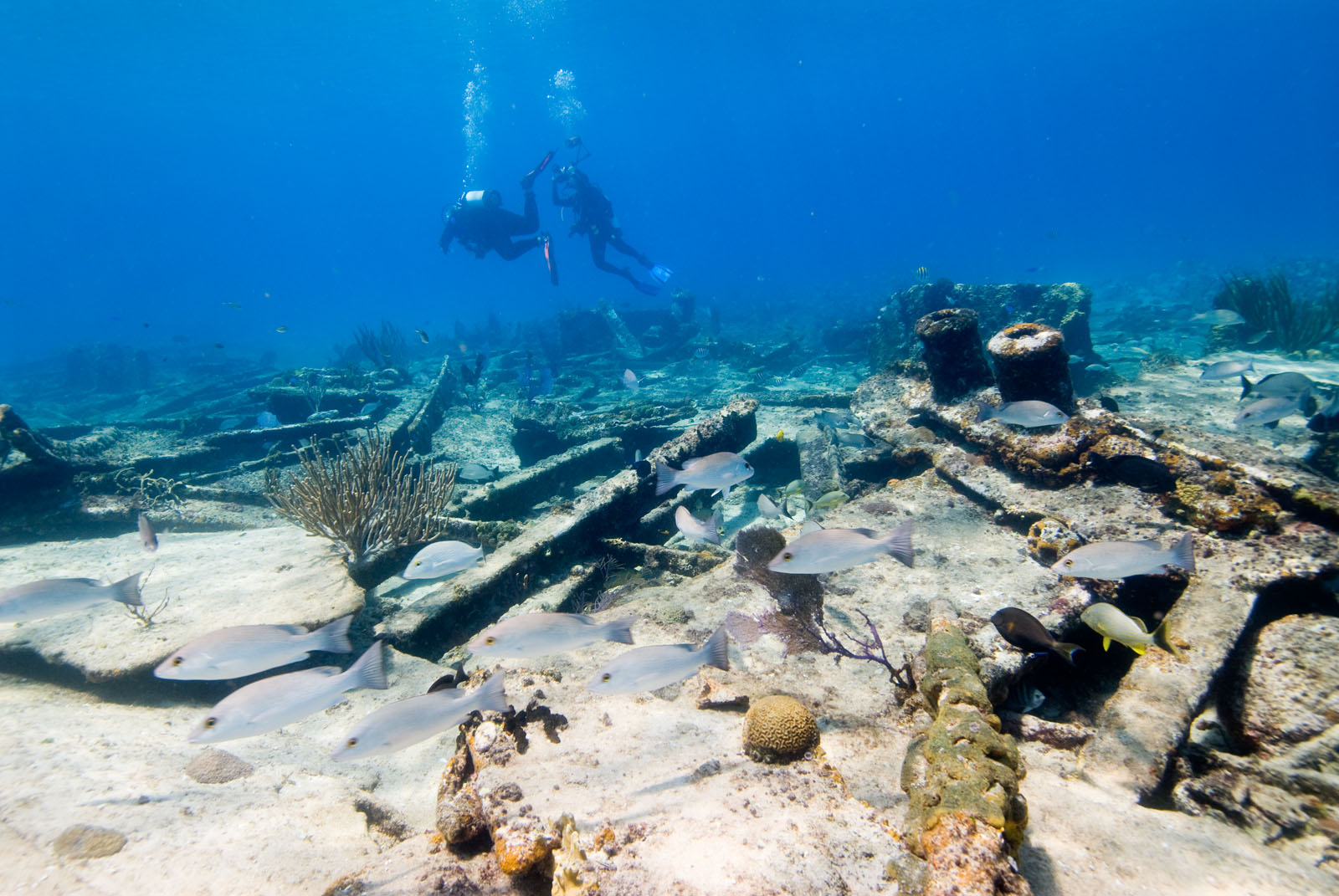 SCUBA divers on the Sugar Wreck north of Grand Bahama Island in the northern Bahamas.