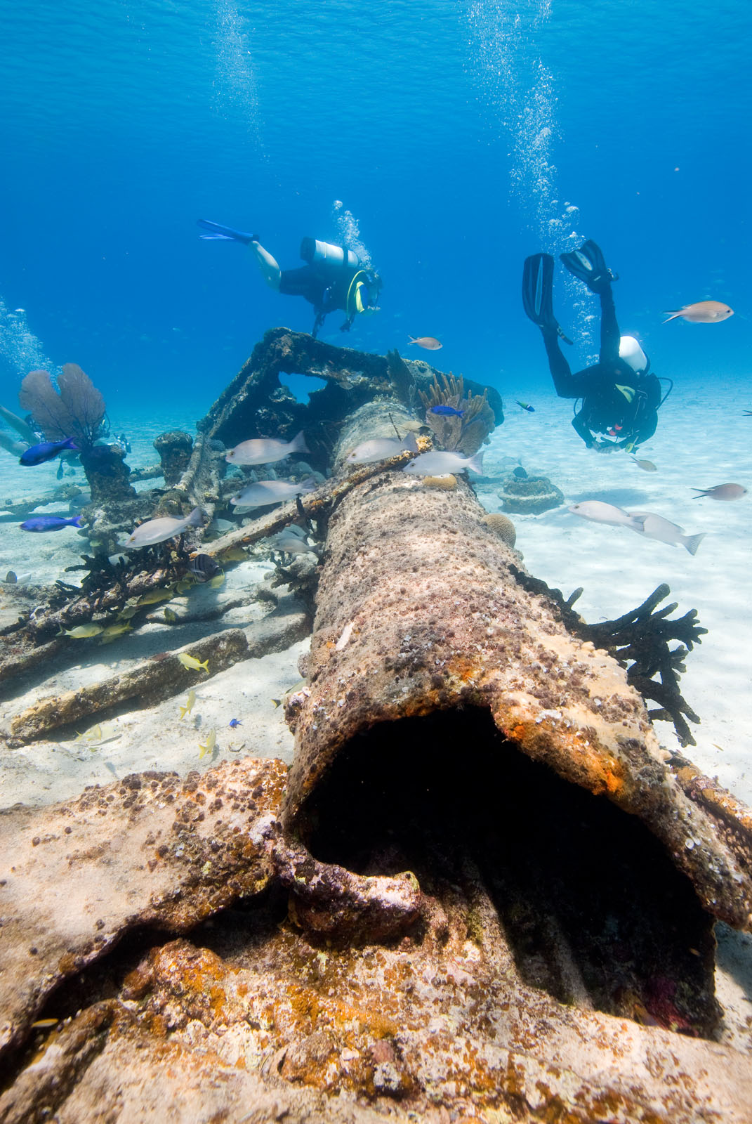 SCUBA divers on the Sugar Wreck north of Grand Bahama Island in the northern Bahamas.