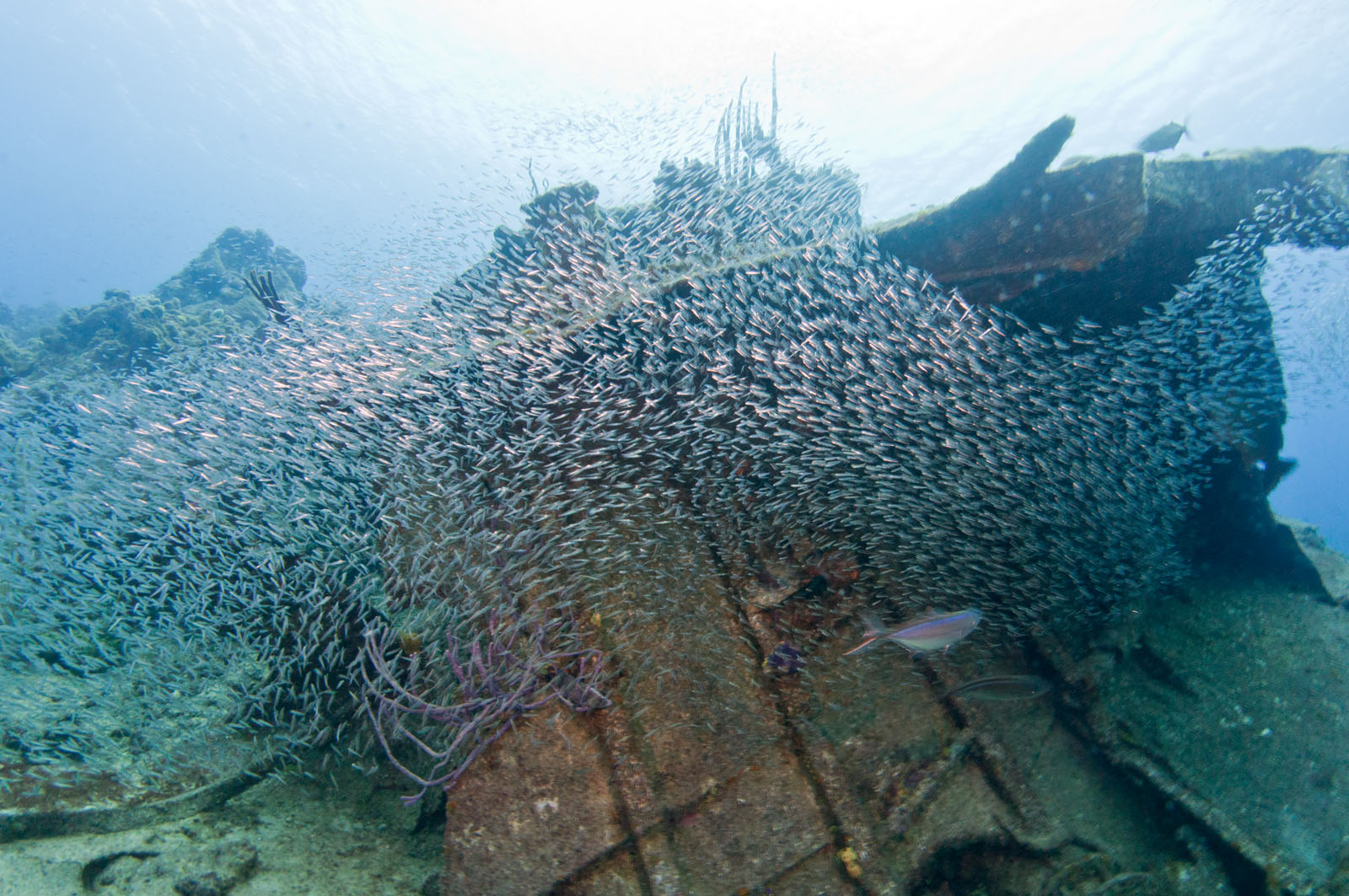 Atlantic silversides, Menidia menidia, on the wreck of the Oro Verde, a 184 foot long liberty ship that was scuttled off the west coast of Grand Cayman on May 31, 1980.