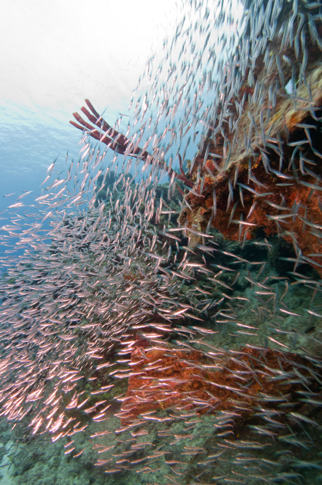 Atlantic silversides, Menidia menidia, on the wreck of the Oro Verde, a 184 foot long liberty ship that was scuttled off the west coast of Grand Cayman on May 31, 1980.