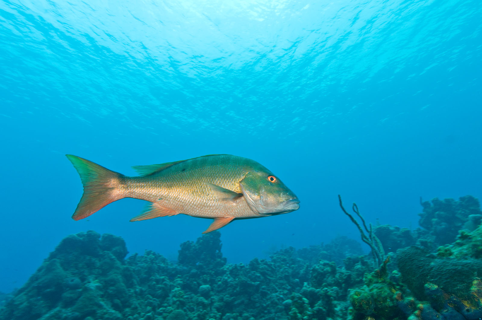 A mutton snapper, Lutjanus analis, on the wreck of the Oro Verde, a 184 foot long liberty ship that was scuttled off the west coast of Grand Cayman on May 31, 1980.