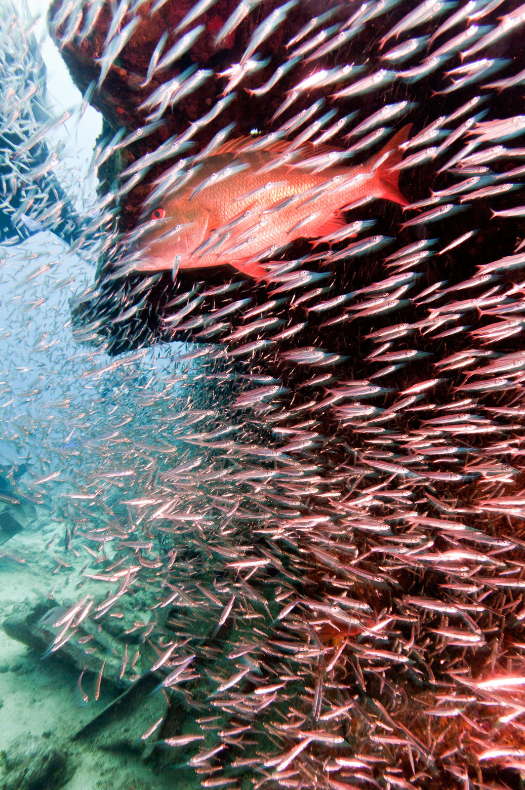 A mutton snapper, Lutjanus analis, swims through a school of Atlantic silversides, Menidia menidia, on the wreck of the Oro Verde, a 184 foot long liberty ship that was scuttled off the west coast of Grand Cayman on May 31, 1980.