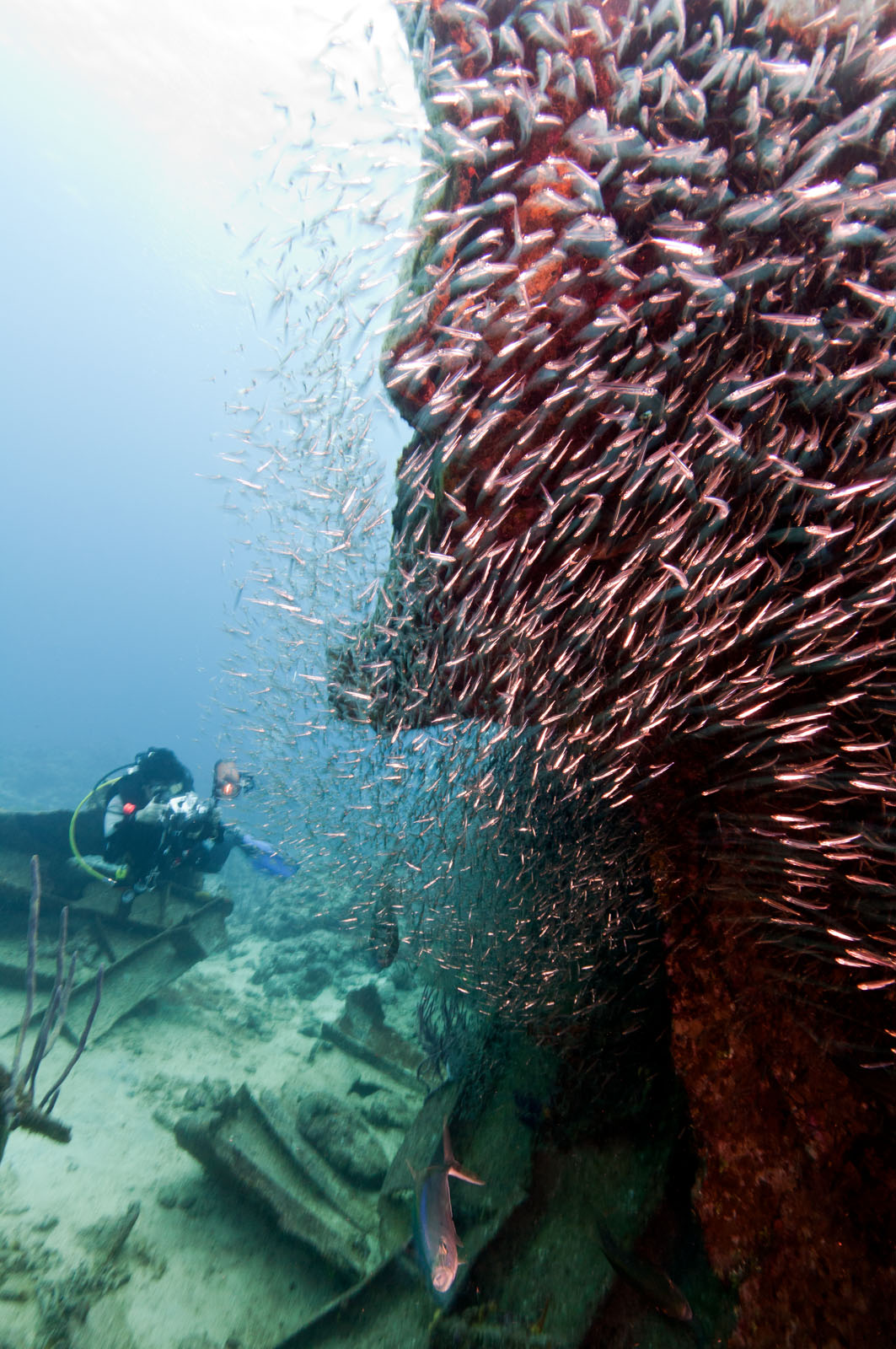 Atlantic silversides, Menidia menidia, on the wreck of the Oro Verde, a 184 foot long liberty ship that was scuttled off the west coast of Grand Cayman on May 31, 1980.