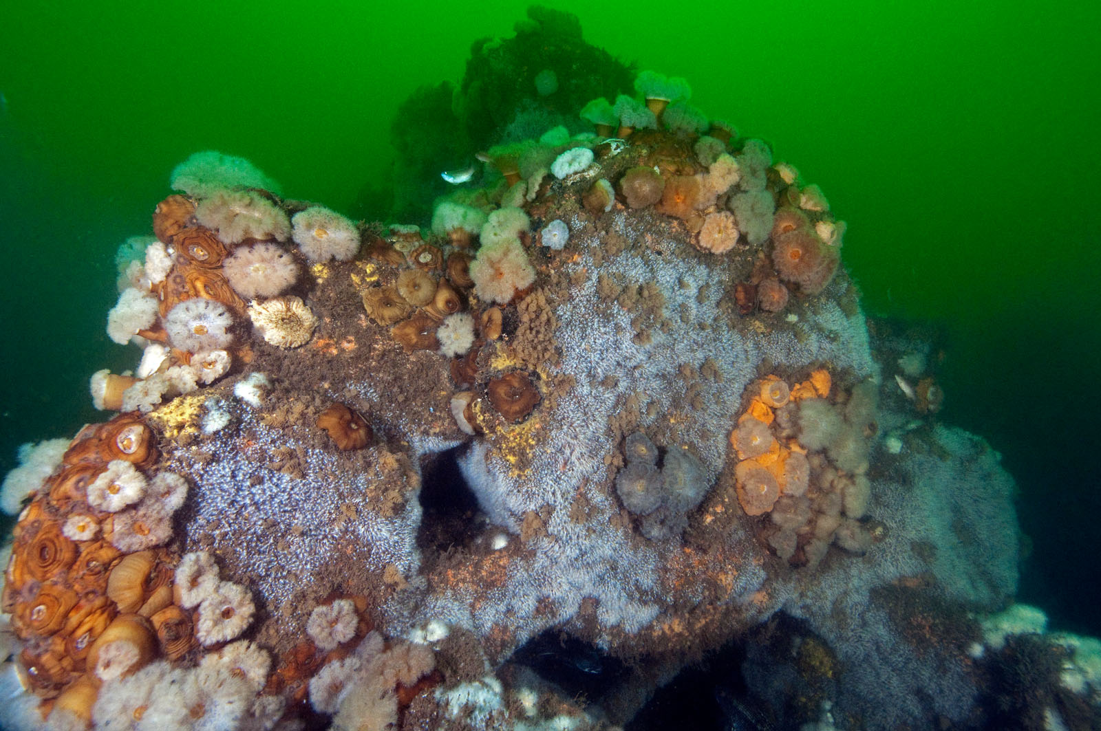 A boiler on the front of a steam locomotive - one of two that lie within twenty feet of each other at a depth of 80' feet in the Atlantic Ocean off the coast of Long Branch, New Jersey, USA. The locomotives date from the 1850's. They may have possibly been built by the Seth Wilmarth Union Works - a South Boston builder of locomotives from 1848 till 1855. The locomotives may be viewed or photographed by SCUBA divers but nothing can be removed and grappling hooks cannot be used to anchor in. The locomotives have a 2-2-2 wheel layout which was rare in the Americas.