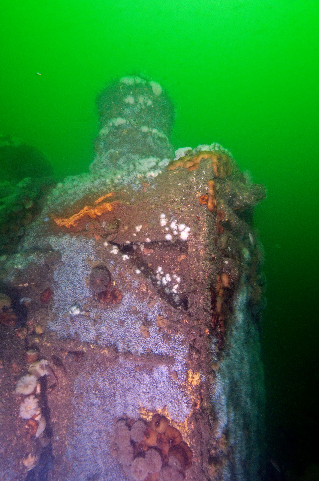 A view of the boiler from the rear of a steam locomotive - one of two that lie within twenty feet of each other at a depth of 80' feet in the Atlantic Ocean off the coast of Long Branch, New Jersey, USA. The locomotives date from the 1850's. They may have possibly been built by the Seth Wilmarth Union Works - a South Boston builder of locomotives from 1848 till 1855. The locomotives may be viewed or photographed by SCUBA divers but nothing can be removed and grappling hooks cannot be used to anchor in. The locomotives have a 2-2-2 wheel layout which was rare in the Americas.
