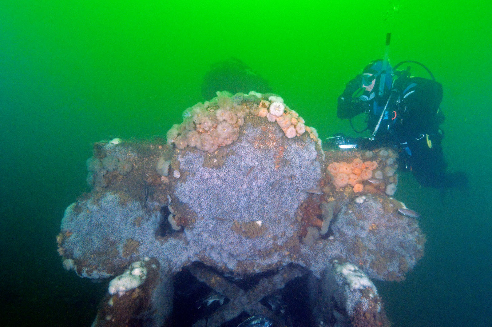 Beth Dalzell of Brick, New Jersey explores a steam locomotive - one of two that lie within twenty feet of each other at a depth of 80' feet in the Atlantic Ocean off the coast of Long Branch, New Jersey, USA. The locomotives date from the 1850's. They may have possibly been built by the Seth Wilmarth Union Works - a South Boston builder of locomotives from 1848 till 1855. The locomotives may be viewed or photographed by SCUBA divers but nothing can be removed and grappling hooks cannot be used to anchor in. The locomotives have a 2-2-2 wheel layout which was rare in the Americas.