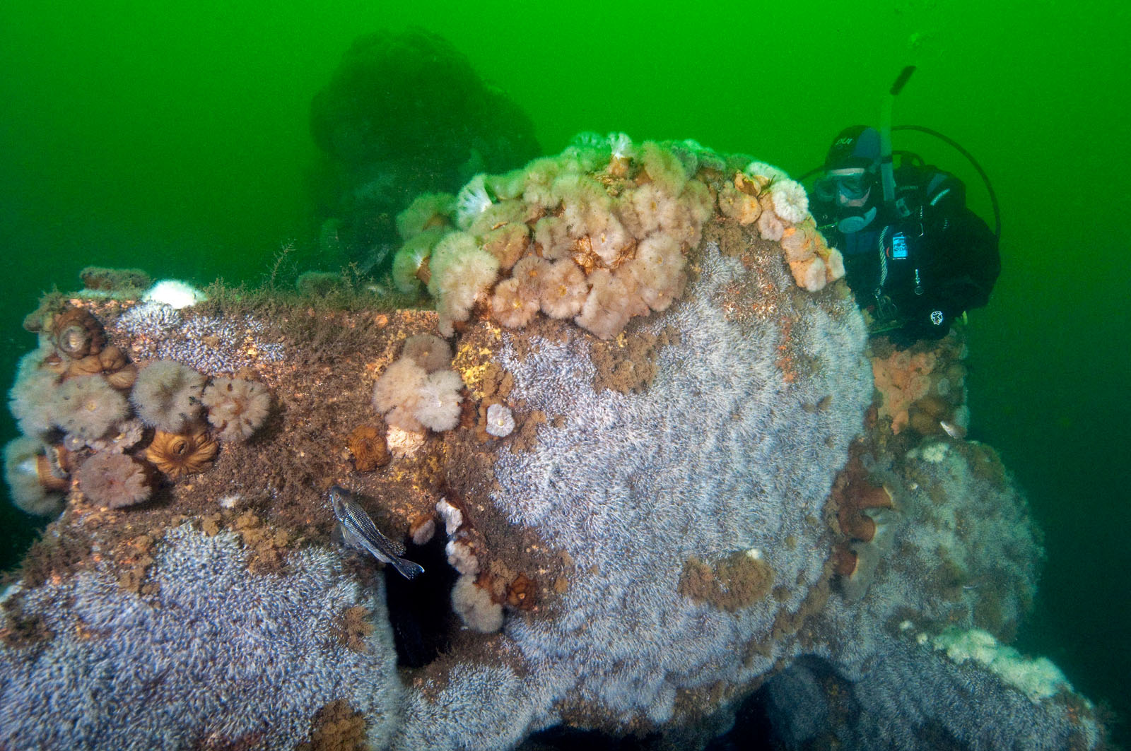 Beth Dalzell of Brick, New Jersey explores a steam locomotive - one of two that lie within twenty feet of each other at a depth of 80' feet in the Atlantic Ocean off the coast of Long Branch, New Jersey, USA. The locomotives date from the 1850's. They may have possibly been built by the Seth Wilmarth Union Works - a South Boston builder of locomotives from 1848 till 1855. The locomotives may be viewed or photographed by SCUBA divers but nothing can be removed and grappling hooks cannot be used to anchor in. The locomotives have a 2-2-2 wheel layout which was rare in the Americas.