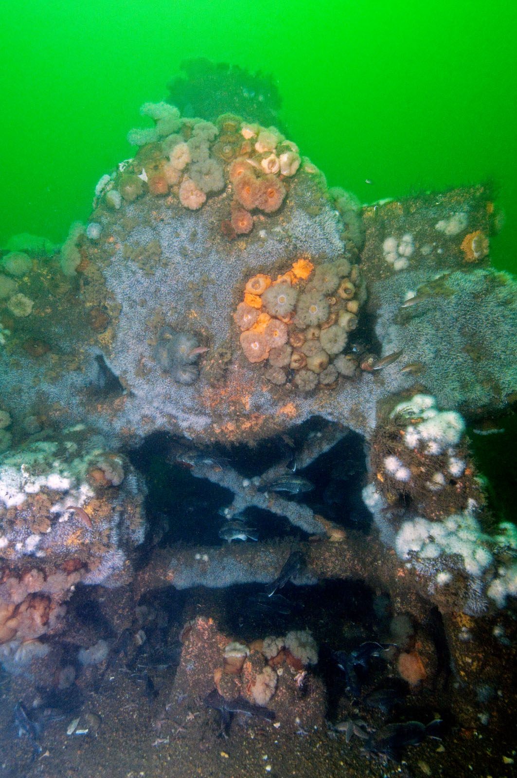 The front end of a steam locomotive - one of two that lie within twenty feet of each other at a depth of 80' feet in the Atlantic Ocean off the coast of Long Branch, New Jersey, USA. The locomotives date from the 1850's. They may have possibly been built by the Seth Wilmarth Union Works - a South Boston builder of locomotives from 1848 till 1855. The locomotives may be viewed or photographed by SCUBA divers but nothing can be removed and grappling hooks cannot be used to anchor in. The locomotives have a 2-2-2 wheel layout which was rare in the Americas.