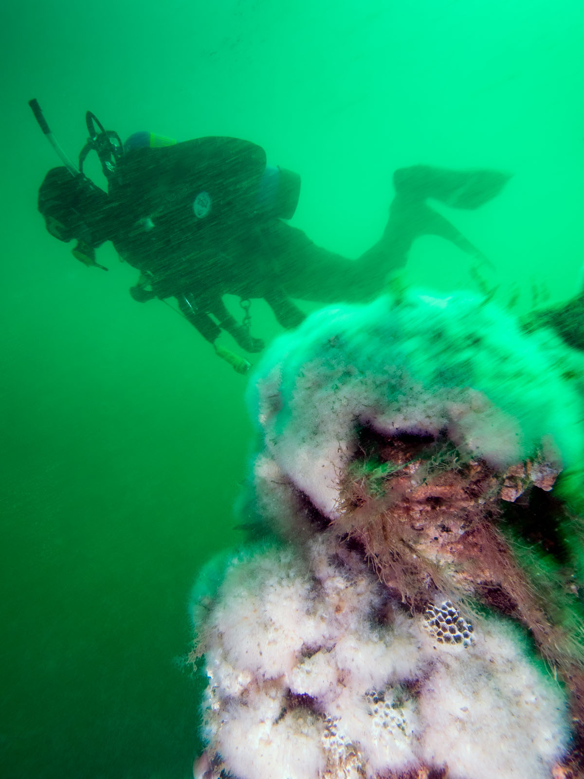 Harry Roecker swims over the Robert J. Walker, sunk on June 21, 1860 in the Atlantic Ocean approximately ten miles off the coast of Atlantic City, New Jersey, USA. The ship collided with a commercial schooner. The ship sunk within an hour and 20 of the 66 crew members died. The RJ Walker is an iron-hulled steam paddle wheeler, 132' long and now lies in 90' of water. The photo was taken as part of the Robert J. Walker Shipwreck Mapping Project.