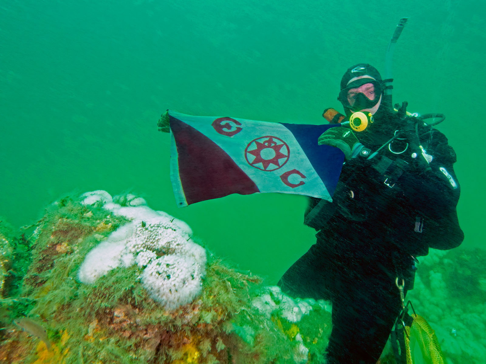 Dan Lieb with The Explorer's Club flag #132 on the Robert J. Walker, sunk on June 21, 1860 in the Atlantic Ocean approximately ten miles off the coast of Atlantic City, New Jersey, USA. The ship collided with a commercial schooner. The ship sunk within an hour and 20 of the 66 crew members died. The RJ Walker is an iron-hulled steam paddle wheeler, 132' long and now lies in 90' of water. The photo was taken as part of the Robert J. Walker Shipwreck Mapping Project.
