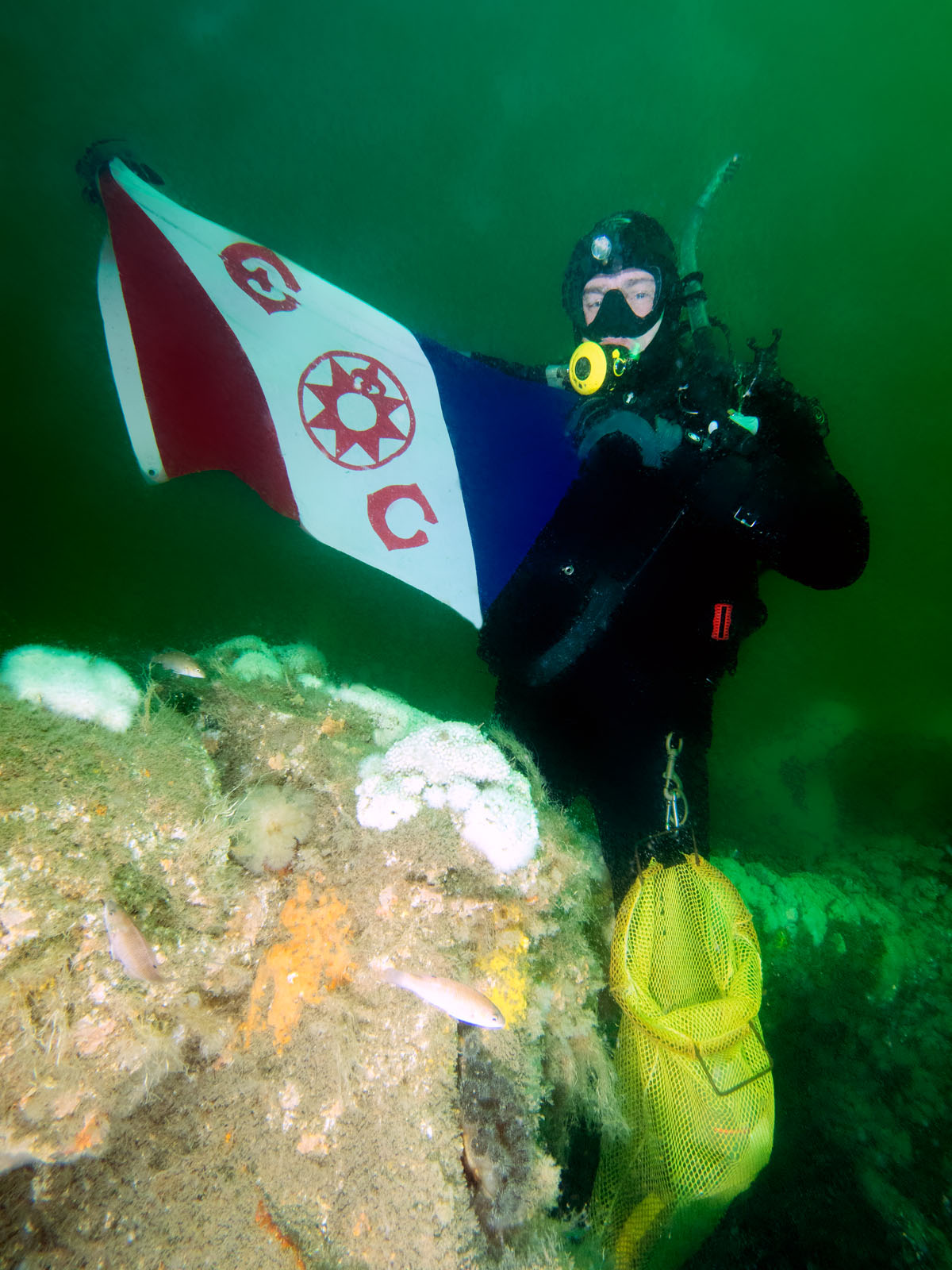 Dan Lieb with The Explorer's Club flag #132 on the Robert J. Walker, sunk on June 21, 1860 in the Atlantic Ocean approximately ten miles off the coast of Atlantic City, New Jersey, USA. The ship collided with a commercial schooner. The ship sunk within an hour and 20 of the 66 crew members died. The RJ Walker is an iron-hulled steam paddle wheeler, 132' long and now lies in 90' of water. The photo was taken as part of the Robert J. Walker Shipwreck Mapping Project.