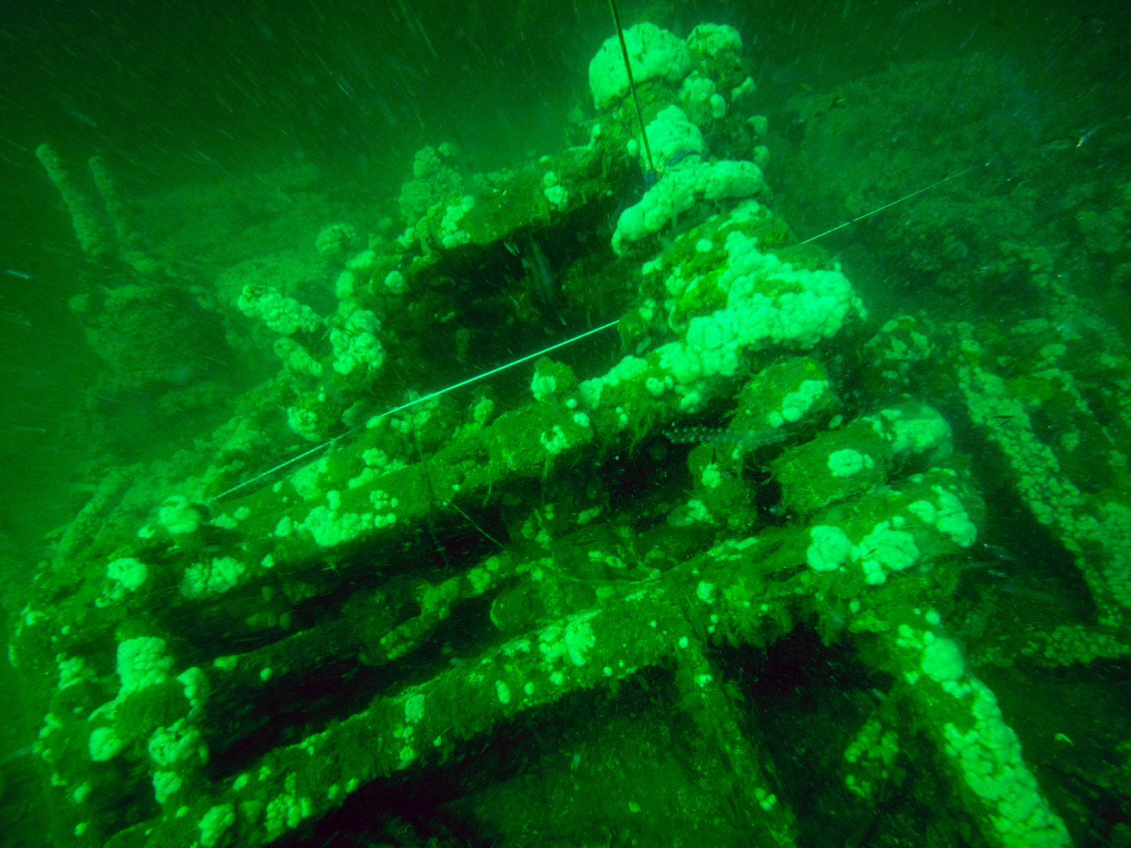 The top of the engine on the Robert J. Walker, sunk on June 21, 1860 in the Atlantic Ocean approximately ten miles off the coast of Atlantic City, New Jersey, USA. The ship collided with a commercial schooner. The ship sunk within an hour and 20 of the 66 crew members died. The RJ Walker is an iron-hulled steam paddle wheeler, 132' long and now lies in 90' of water. The photo was taken as part of the Robert J. Walker Shipwreck Mapping Project.