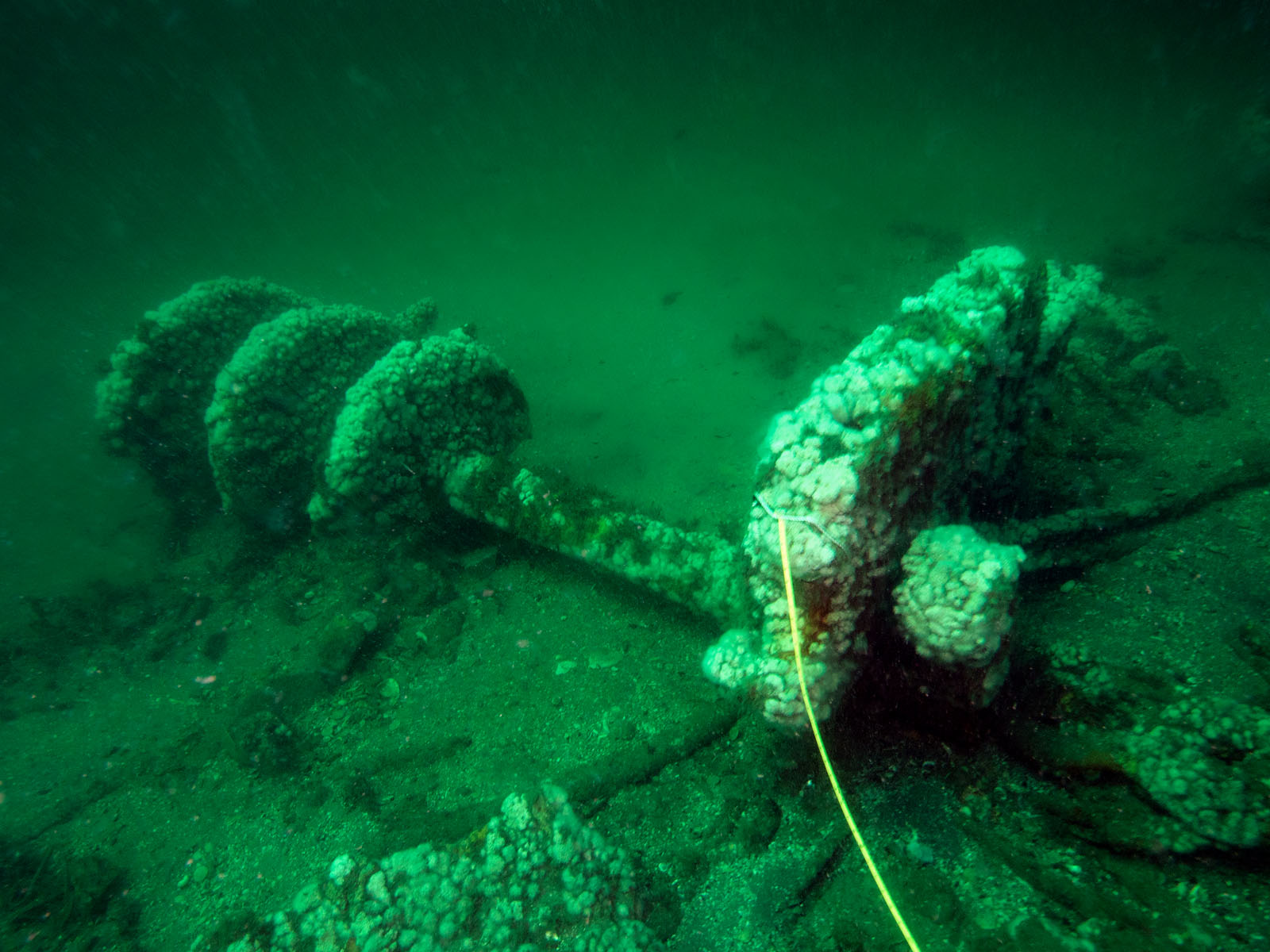A paddle wheel hub on the Robert J. Walker, sunk on June 21, 1860 in the Atlantic Ocean approximately ten miles off the coast of Atlantic City, New Jersey, USA. The ship collided with a commercial schooner. The ship sunk within an hour and 20 of the 66 crew members died. The RJ Walker is an iron-hulled steam paddle wheeler, 132' long and now lies in 90' of water. The photo was taken as part of the Robert J. Walker Shipwreck Mapping Project.
