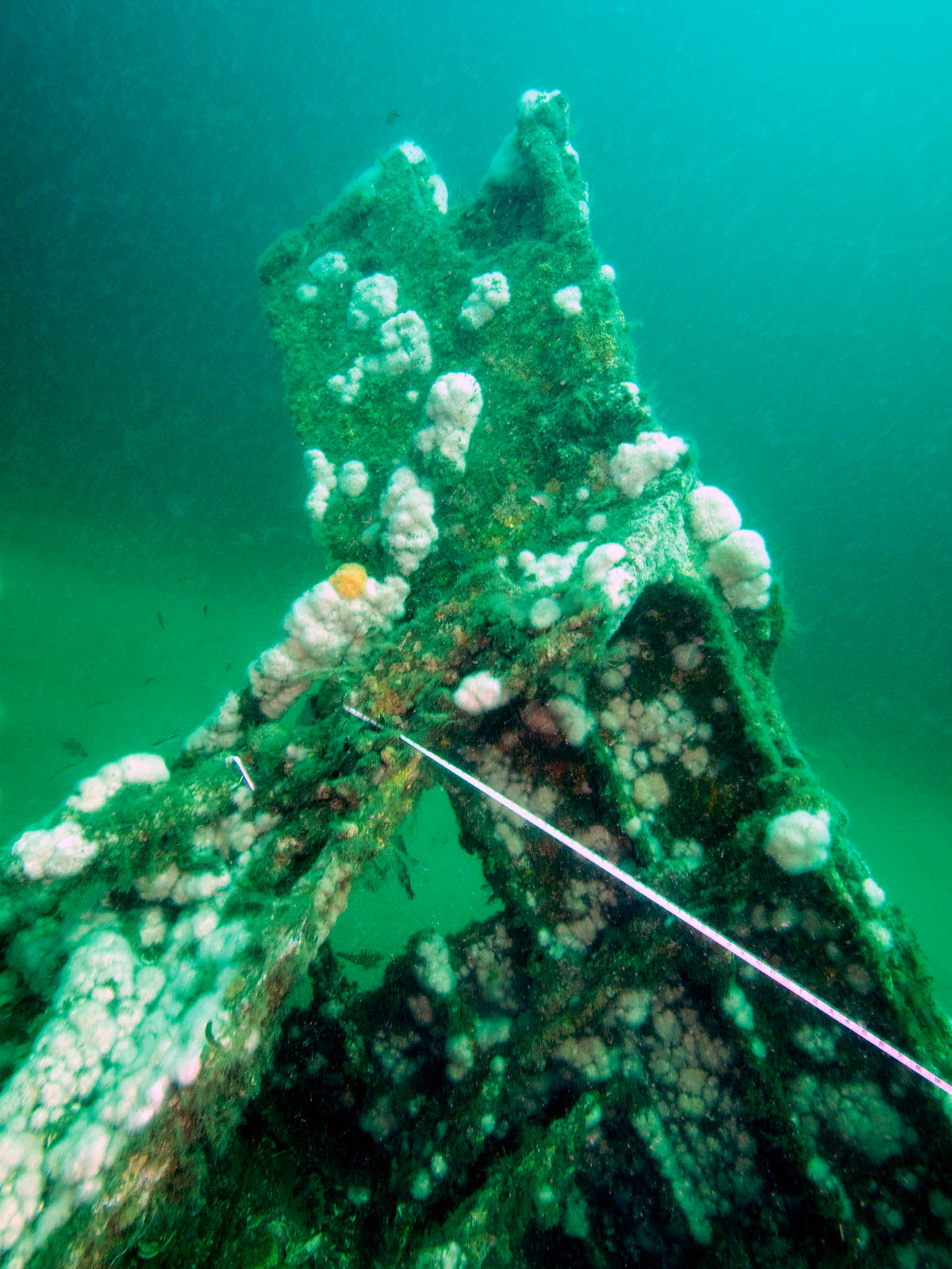 The bow of the Robert J. Walker, sunk on June 21, 1860 in the Atlantic Ocean approximately ten miles off the coast of Atlantic City, New Jersey, USA. The ship collided with a commercial schooner. The ship sunk within an hour and 20 of the 66 crew members died. The RJ Walker is an iron-hulled steam paddle wheeler, 132' long and now lies in 90' of water. The photo was taken as part of the Robert J. Walker Shipwreck Mapping Project.