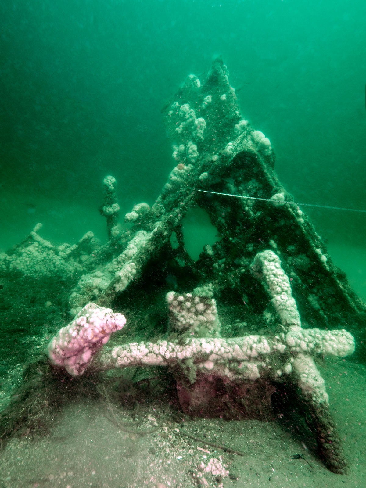 The bow and one of the three anchors on the Robert J. Walker, sunk on June 21, 1860 in the Atlantic Ocean approximately ten miles off the coast of Atlantic City, New Jersey, USA. The ship collided with a commercial schooner. The ship sunk within an hour and 20 of the 66 crew members died. The RJ Walker is an iron-hulled steam paddle wheeler, 132' long and now lies in 90' of water. The photo was taken as part of the Robert J. Walker Shipwreck Mapping Project.