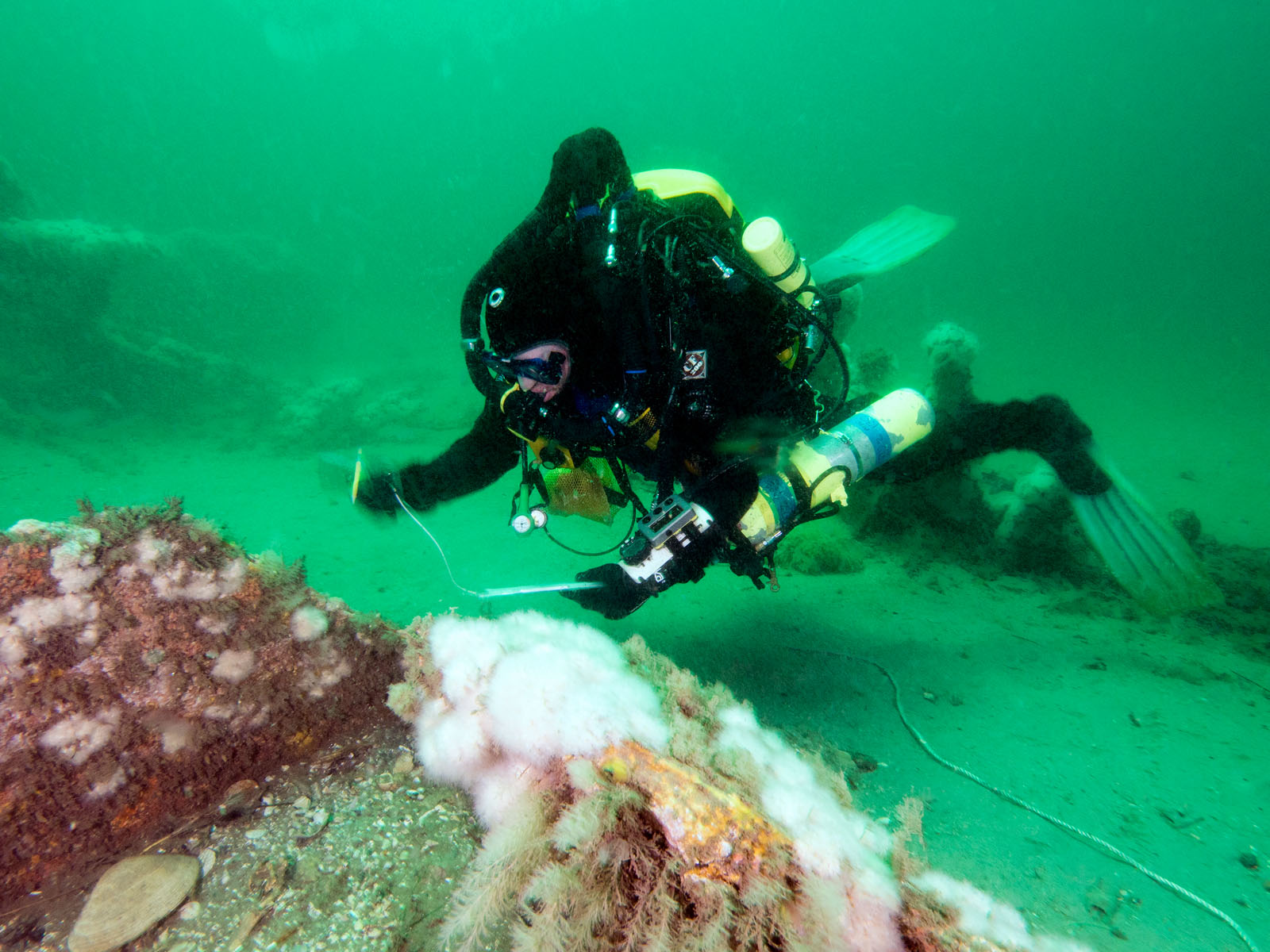 Shawn Sweeney maps the Robert J. Walker, sunk on June 21, 1860 in the Atlantic Ocean approximately ten miles off the coast of Atlantic City, New Jersey, USA. The ship collided with a commercial schooner. The ship sunk within an hour and 20 of the 66 crew members died. The RJ Walker is an iron-hulled steam paddle wheeler, 132' long and now lies in 90' of water. The photo was taken as part of the Robert J. Walker Shipwreck Mapping Project.