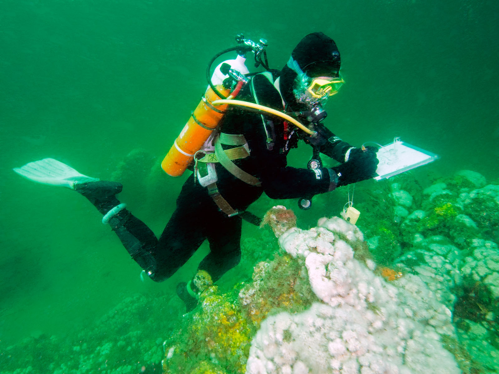 Harry Roecker maps the Robert J. Walker, sunk on June 21, 1860 in the Atlantic Ocean approximately ten miles off the coast of Atlantic City, New Jersey, USA. The ship collided with a commercial schooner. The ship sunk within an hour and 20 of the 66 crew members died. The RJ Walker is an iron-hulled steam paddle wheeler, 132' long and now lies in 90' of water. The photo was taken as part of the Robert J. Walker Shipwreck Mapping Project.
