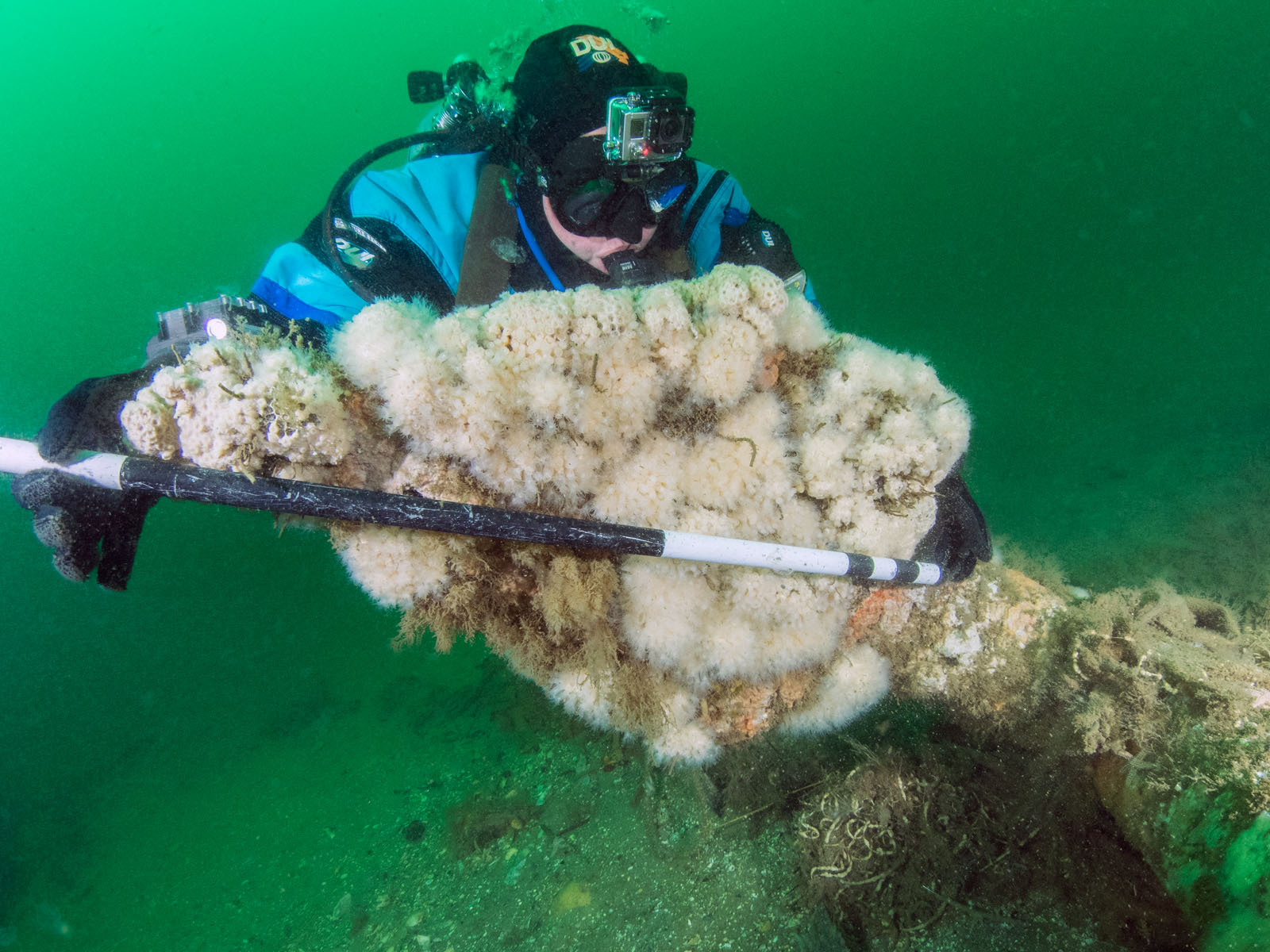 Joyce Steinmetz uses a metered pole to measure the anchor fluke on one of the three anchors on the Robert J. Walker, sunk on June 21, 1860 in the Atlantic Ocean approximately ten miles off the coast of Atlantic City, New Jersey, USA. The ship collided with a commercial schooner. The ship sunk within an hour and 20 of the 66 crew members died. The RJ Walker is an iron-hulled steam paddle wheeler, 132' long and now lies in 90' of water. The photo was taken as part of the Robert J. Walker Shipwreck Mapping Project.