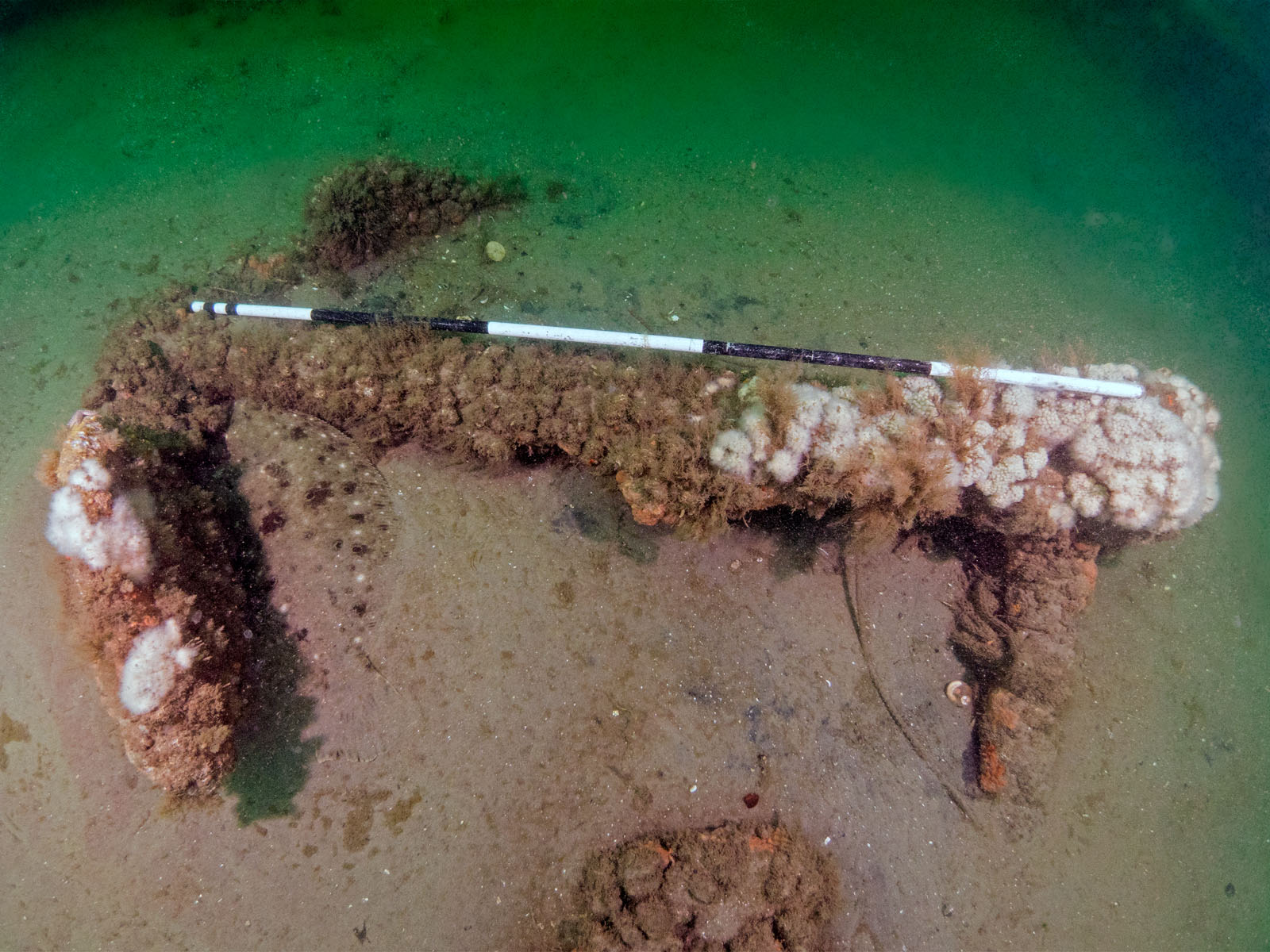 Joyce Steinmetz uses a metered pole to measure the anchor shank on one of the three anchors on the Robert J. Walker, sunk on June 21, 1860 in the Atlantic Ocean approximately ten miles off the coast of Atlantic City, New Jersey, USA. The ship collided with a commercial schooner. The ship sunk within an hour and 20 of the 66 crew members died. The RJ Walker is an iron-hulled steam paddle wheeler, 132' long and now lies in 90' of water. The photo was taken as part of the Robert J. Walker Shipwreck Mapping Project.