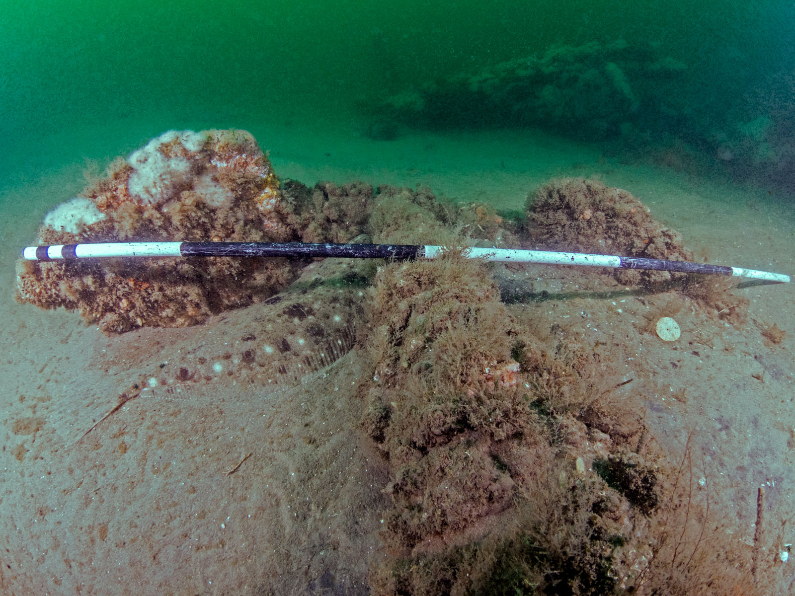 Joyce Steinmetz uses a metered pole to measure the anchor fluke on one of the three anchors on the Robert J. Walker, sunk on June 21, 1860 in the Atlantic Ocean approximately ten miles off the coast of Atlantic City, New Jersey, USA. The ship collided with a commercial schooner. The ship sunk within an hour and 20 of the 66 crew members died. The RJ Walker is an iron-hulled steam paddle wheeler, 132' long and now lies in 90' of water. The photo was taken as part of the Robert J. Walker Shipwreck Mapping Project.
