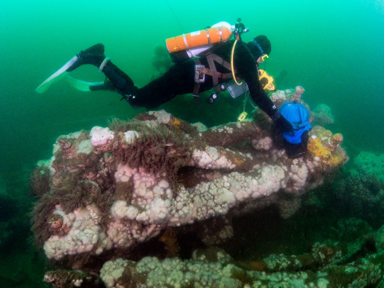 Harry Roecker maps the Robert J. Walker, sunk on June 21, 1860 in the Atlantic Ocean approximately ten miles off the coast of Atlantic City, New Jersey, USA. The ship collided with a commercial schooner. The ship sunk within an hour and 20 of the 66 crew members died. The RJ Walker is an iron-hulled steam paddle wheeler, 132' long and now lies in 90' of water. The photo was taken as part of the Robert J. Walker Shipwreck Mapping Project.