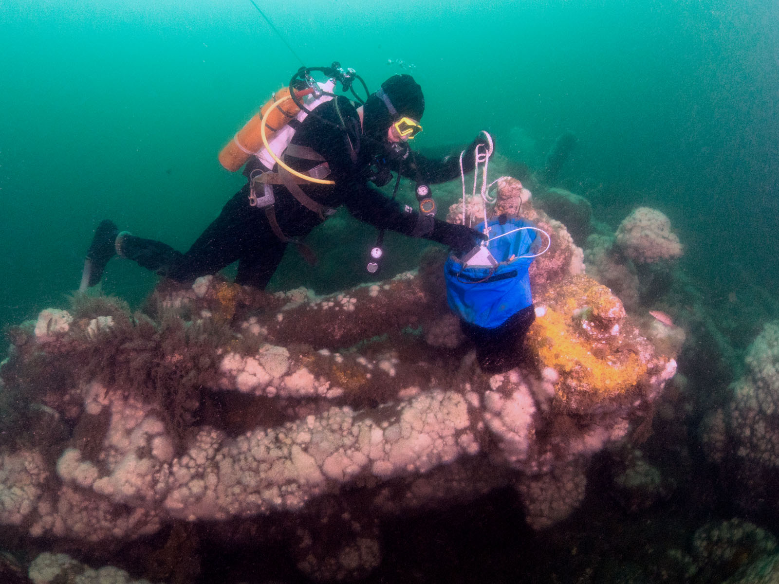 Harry Roecker maps the Robert J. Walker, sunk on June 21, 1860 in the Atlantic Ocean approximately ten miles off the coast of Atlantic City, New Jersey, USA. The ship collided with a commercial schooner. The ship sunk within an hour and 20 of the 66 crew members died. The RJ Walker is an iron-hulled steam paddle wheeler, 132' long and now lies in 90' of water. The photo was taken as part of the Robert J. Walker Shipwreck Mapping Project.